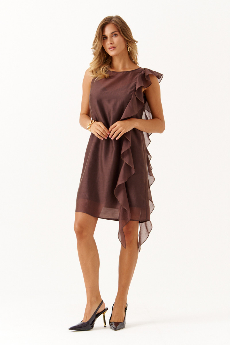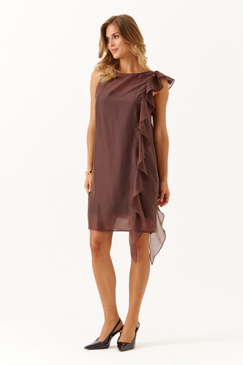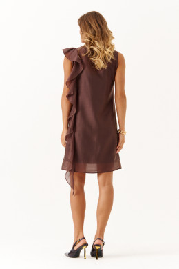 Женское коричневое платье миди из хлопковой ткани с добавлением вискозы. Стильное и комфортное платье, чуть расширенное к низу, идеально подойдет для повседневных образов. Перед платья имеет две нагрудные вытачки. Особенность платья — притачной волан, проходящий от низа изделия через окат рукава и до низа, создавая эффект мягкого рюша. Платье на широких бретелях с подкладкой из струящейся ткани (нижнее платье) обеспечивает комфорт и легкость в носке. Перед украшен двумя нагрудными вытачками и V-образной горловиной как спереди, так и сзади, добавляя изящность. Идеальный вариант для стильных и женственных образов.