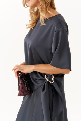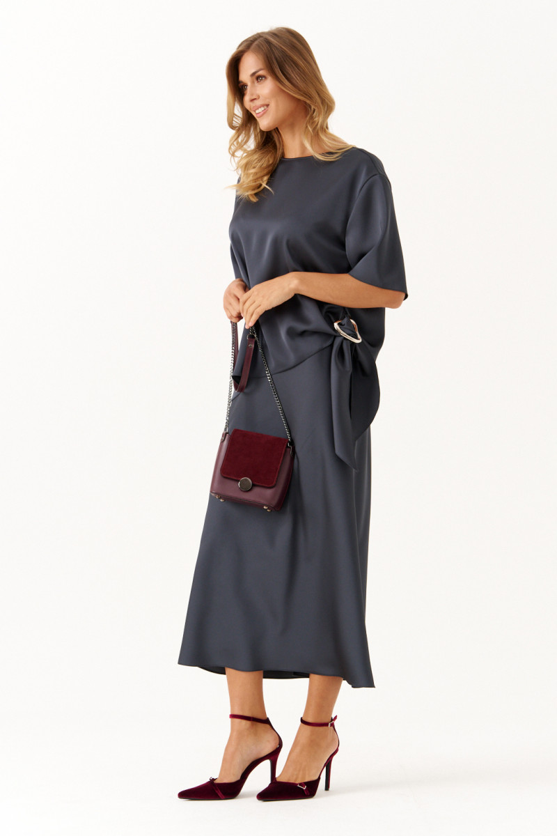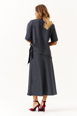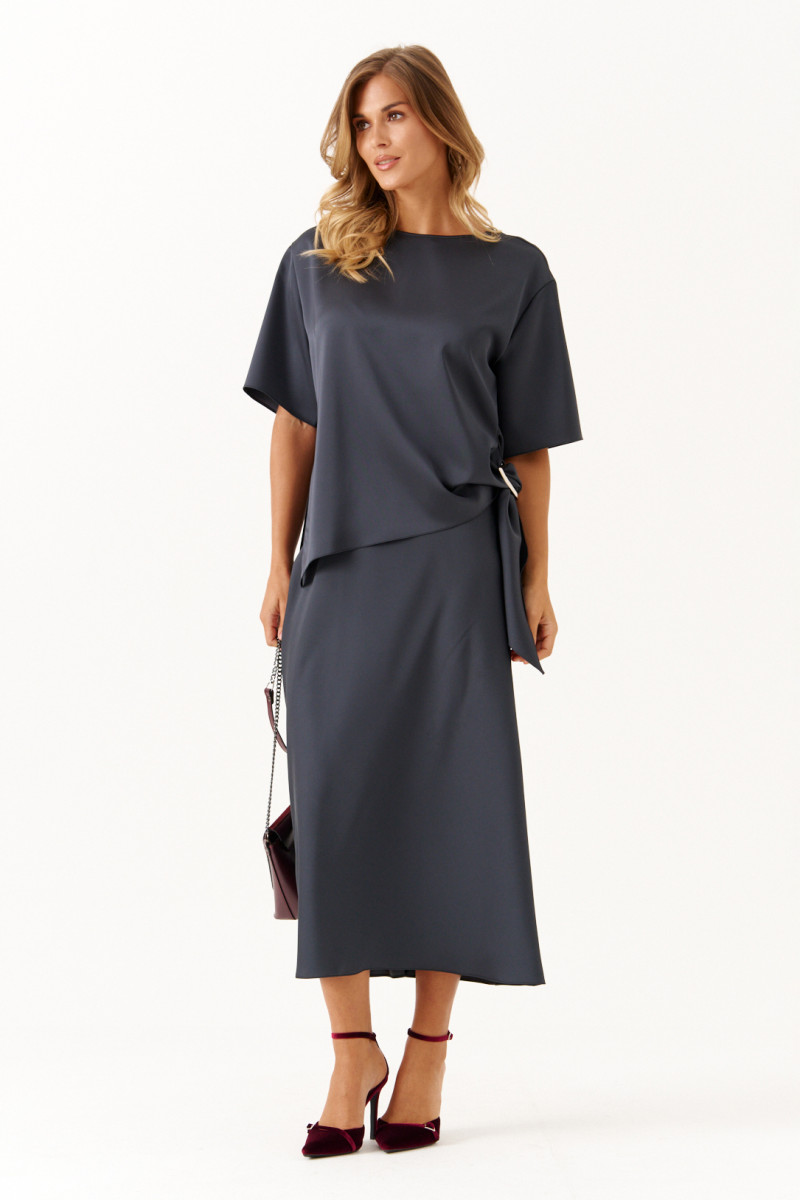 Стильный и комфортный костюм для повседневной носки состоит из блузки и юбки. Блузка имеет прямой силуэт с расширенной горловиной, втачными рукавами длиной чуть ниже локтя и аккуратными боковыми разрезами, украшенными декоративным узлом с серебряной пряжкой, что придает образу изысканность. Юбка выкроена по косой, обеспечивая элегантный и плавный силуэт. Верхний срез юбки обработан внутренней резинкой для комфортной посадки, длина модели — до щиколотки, добавляющая женственности и легкости. Этот графитовый костюм сочетает в себе изящество атласа и удобство, прекрасно подходя как для повседневных образов, так и для более официальных мероприятий.