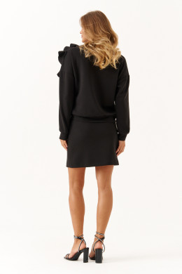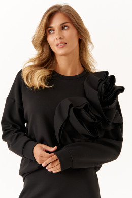 Женский костюм из мягкого трикотажа — комфорт и стиль в каждой детали. Этот изысканный костюм состоит из джемпера и юбки, выполненный из приятного на ощупь мягкого трикотажного полотна. Джемпер отличается прямым силуэтом и оригинальной декоративной полоской на передней части, образующей стильные цветочные мотивы. Спущенная линия плеча и длинные втачные рукава с аккуратными манжетами создают современный, слегка расслабленный образ. Горловина оформлена качественной тесьмой, а низ изделия и рукава обработаны притачными деталями, подчеркивающими аккуратный внешний вид. Для дополнительного комфорта и прочности передняя часть джемпера выполнена на подкладке. Юбка трапециевидного кроя с притачным поясом, внутри которого расположена удобная резинка для идеальной посадки по талии. Две талиевые вытачки на заднем полотнище придают юбке женственный силуэт, подчеркивая фигуру. Костюм выполнен в элегантном черном оттенке — универсальном и практичном, который легко сочетать с аксессуарами и обувью как для делового, так и для повседневного образа.
