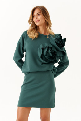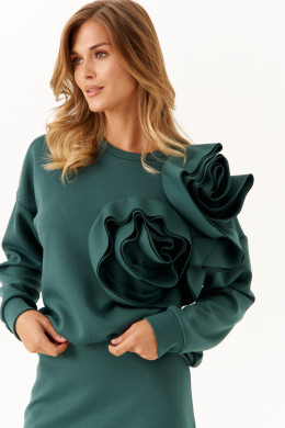 Женский костюм из мягкого трикотажа — комфорт и стиль в каждой детали. Этот изысканный костюм состоит из джемпера и юбки, выполненный из приятного на ощупь мягкого трикотажного полотна. Джемпер отличается прямым силуэтом и оригинальной декоративной полоской на передней части, образующей стильные цветочные мотивы. Спущенная линия плеча и длинные втачные рукава с аккуратными манжетами создают современный, слегка расслабленный образ. Горловина оформлена качественной тесьмой, а низ изделия и рукава обработаны притачными деталями, подчеркивающими аккуратный внешний вид. Для дополнительного комфорта и прочности передняя часть джемпера выполнена на подкладке. Юбка трапециевидного кроя с притачным поясом, внутри которого расположена удобная резинка для идеальной посадки по талии. Две талиевые вытачки на заднем полотнище придают юбке женственный силуэт, подчеркивая фигуру. Юбка выполнена на подкладке. Костюм выполнен в элегантном изумрудном оттенке — универсальном и практичном, который легко сочетать с аксессуарами и обувью как для делового, так и для повседневного образа.