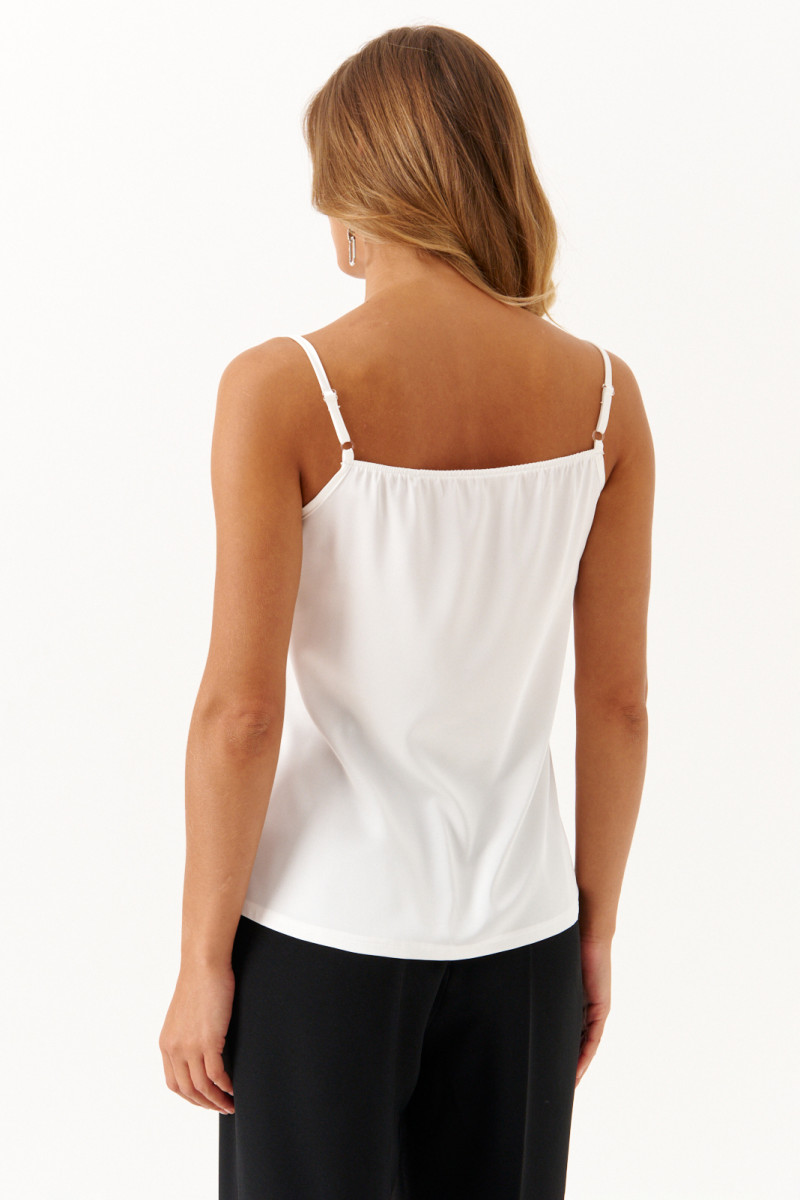 Женская блузка из струящейся ткани создана для комфорта и элегантности в повседневной носке. Модель прямого силуэта отличается лёгкостью и воздушностью благодаря мягкому материалу, который свободно струится по телу. Перед блузки изысканно украшен притачным кружевом с рельефным швом, придающим изделию особую изящность и женственность. Блузка выполнена на тонких бретелях, что делает её идеальным выбором для тёплой погоды или многослойного образа.