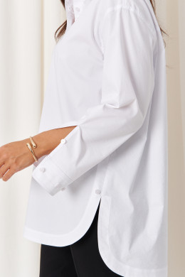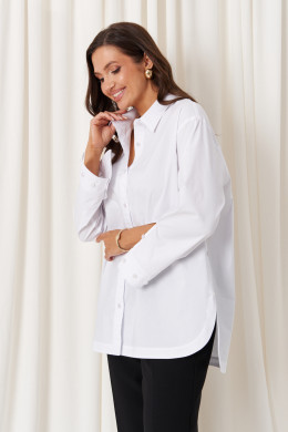 Особенностью дизайна является асимметричный крой: передний край блузки выполнен полукруглым и чуть короче спинки, создавая стильный и современный силуэт. Цвет блузки – белый, что делает её универсальной и легко сочетаемой с различными нарядами. Эта блузка станет отличным дополнением гардероба, сочетая комфорт с элегантностью и классикой.
