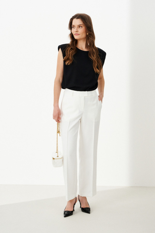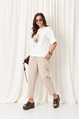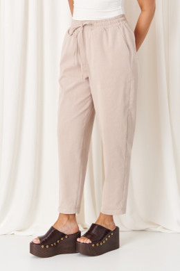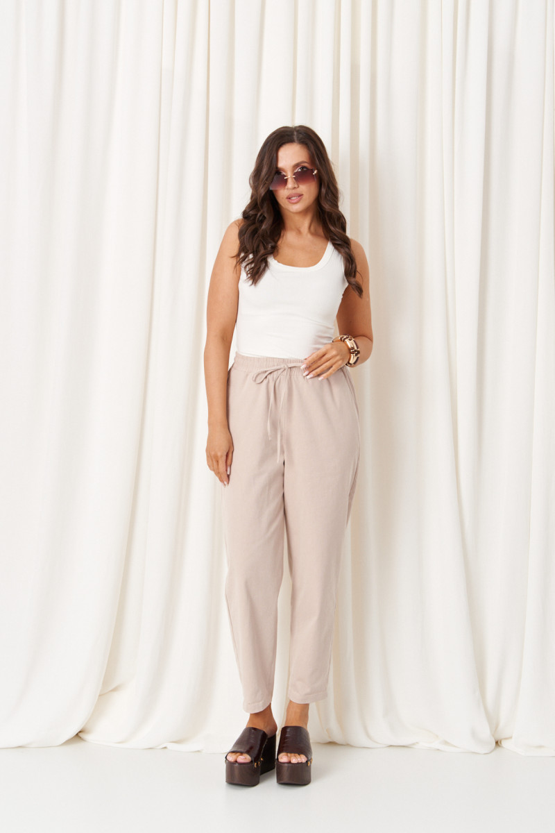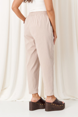 Эти женские брюки выполнены из натуральной хлопковой ткани, что обеспечивает комфорт и хорошую воздухопроницаемость, делая их идеальным выбором для повседневной носки. Модель заужена к низу, создавая современный и стройнящий силуэт. Верхний срез брючин обработан притачным поясом с вставкой на резинке, благодаря чему посадка максимально удобная и легко регулируется. В пояс вставлен шнурок, который позволяет дополнительно регулировать объем по талии и обеспечивать надежную фиксацию. Задняя часть брюк украшена двумя талиевыми вытачками, подчеркивающими линию фигуры и создающими аккуратный силуэт. В боковых швах расположены прорезные карманы с подкройным бочком, что обеспечивает функциональность и стильный внешний вид. Длина брюк классическая, что делает их универсальным элементом гардероба. Голубой цвет придает образу свежести и природной натуральности, легко комбинируется с разными верхами. Эти брюки идеально подойдут для комфортных прогулок, работы, сочетаясь с разнообразными топами, рубашками и свитерами.