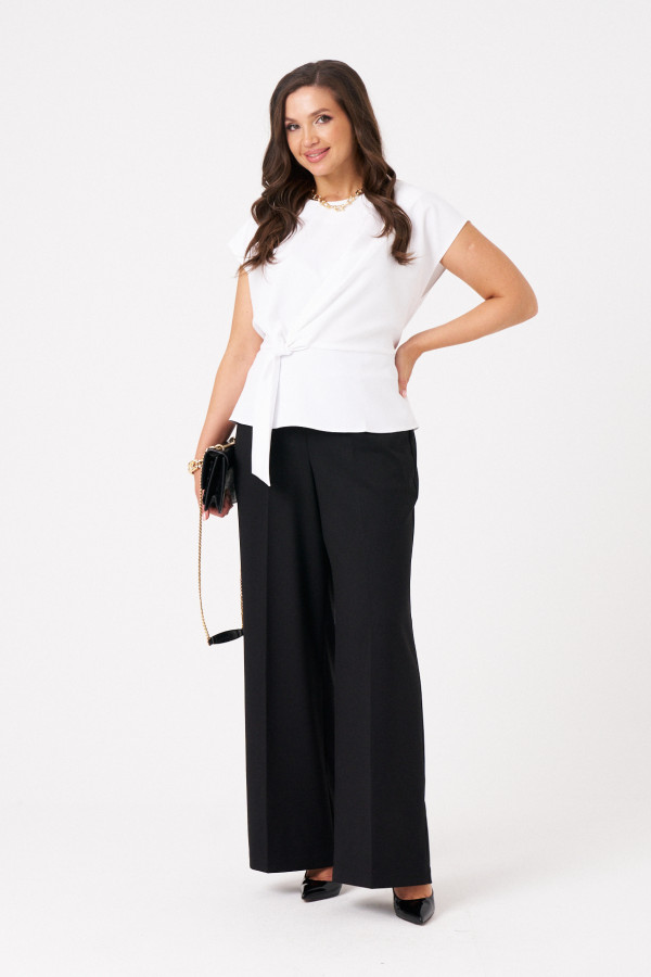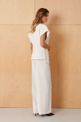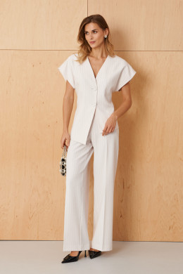 Это женский костюм из струящейся ткани, состоящий из жакета и брюк, выполненных в мягкой молочной палитре с легкой полоской. Жакет обладает полуприлегающим силуэтом, создавая элегантный и современный силуэт. Центральная застежка бортовая оформлена на обметанные петли и пуговицы, а криволинейный край борта делает модель визуально более интересной, одна часть которого чуть длиннее другой. Перед украшен двумя вертикальными рельефами, идущими от плечевого шва до линии низа. Спинка оформлена со средним швом и двумя вертикальными рельефами, добавляющими объем и форму. В боковых швах расположены небольшие разрезы, обеспечивающие удобство и слегка свободный ход. Вырез горловины выполнен в V-образной форме, а короткие рукава добавляют образу легкости и практичности. Брюки классического прямого кроя, верхний срез обработан притачным поясом, в который вшита застежка — на одну обметанную петлю с пуговицей и потайная молния в боковом шве. В задней части брюк расположены две талиевые вытачки, обеспечивающие хорошую посадку. Костюм полностью на подкладке, что повышает комфорт и качество носки. Универсальный и стильный, он подойдет для деловых встреч, офисных образов или повседневных мероприятий.