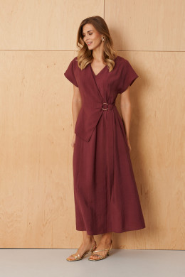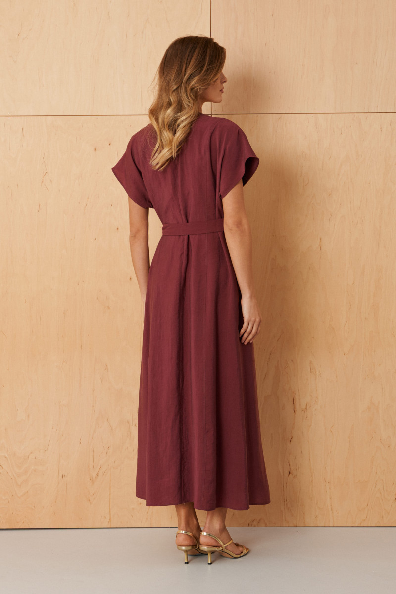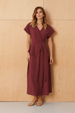 Это женское платье, выполненное из поливискозной ткани, идеально подходящее для повседневной носки. Модель обладает полуприлегающим силуэтом, обеспечивающим комфорт и современный стиль. Перед украшен декоративной отлетной деталью, которая добавляет изящности и выразительности образу; эта деталь регулируется с помощью пояса, вставленного в боковой шов, что позволяет легко корректировать посадку и подчеркивать талию. На передней части расположены вертикальные рельефы, идущие от плечевого шва до линии низа, что создает изысканный визуальный эффект и подчеркивает линию силуэта. Спинка украшена средним швом и вставленной потайной застежкой-молнией, а также двумя вертикальными рельефами, которые добавляют структуру и аккуратность посадки. Вырез горловины выполнен в V-образной форме, что придает образу женственность и элегантность. Короткие рукава делают платье комфортным для теплых дней. Длина модели достигает макси. Цвет платья — бордовый, что делает его легко сочетаемым с разнообразными аксессуарами и обувью, создавая стильный и практичный повседневный образ.