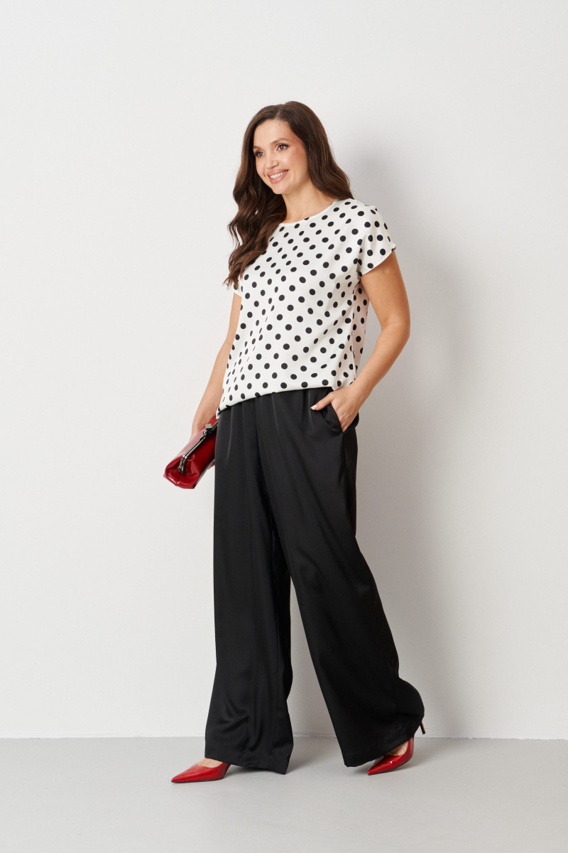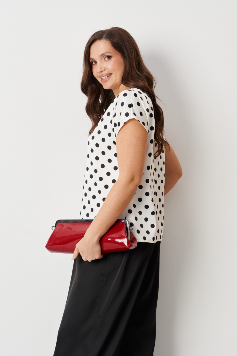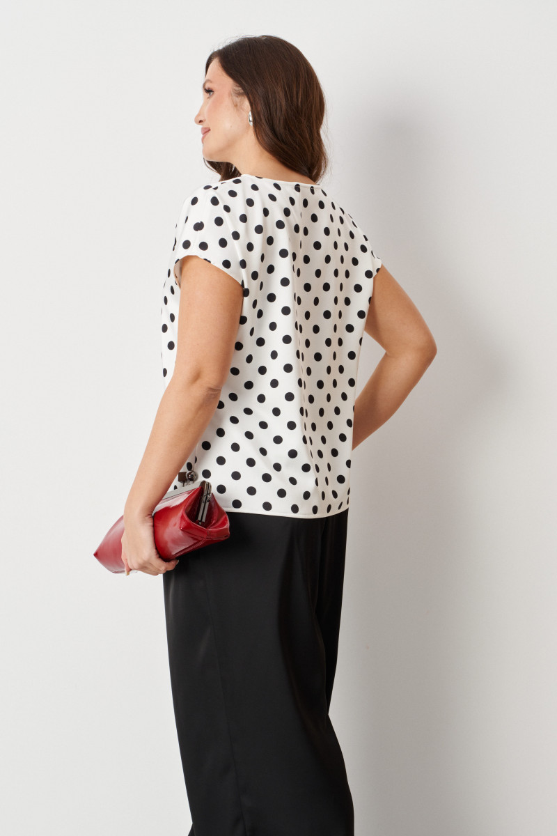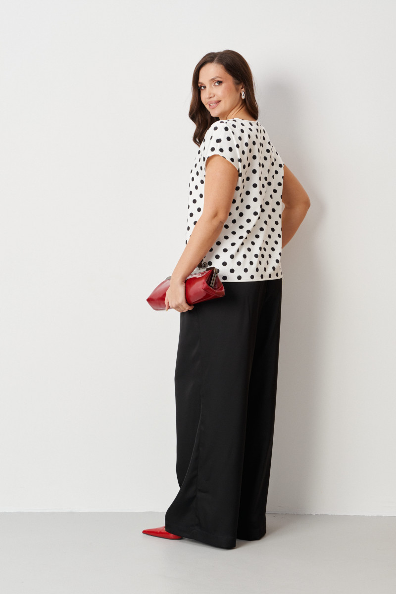 Эта женская базовая блуза прямого силуэта в молочном оттенке с классическим принтом в горошек — универсальный и стильный элемент гардероба. Изготовленная из атласной ткани, она идеально подходит для повседневной носки, сочетаясь с юбками, брюками и джинсами для создания разнообразных образов. Легкая и приятная на ощупь, блуза обладает гладкой поверхностью, которая не вызывает дискомфорта даже в жаркую погоду. Свободный крой с опущенной линией плеча и короткими цельнокроеными рукавами обеспечивает безупречную посадку и комфорт в движении, делая ее незаменимым предметом для любого повседневного образа.