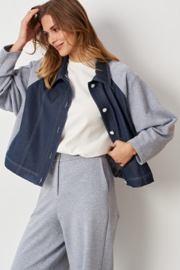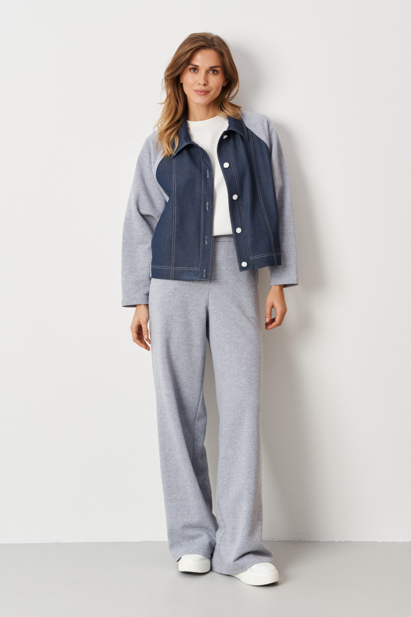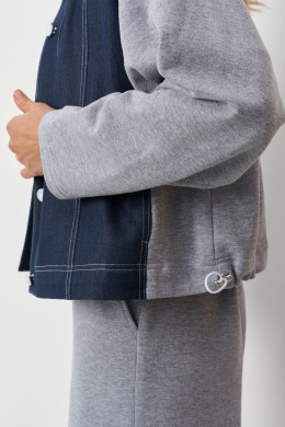 Это женский костюм выполнен из поливискозной джинсовой ткани с вставками из трикотажного полотна, что обеспечивает комфорт и стильный внешний вид. В его состав входят жакет и прямые брюки. Застежка в жакете центральная бортовая на обметанные петли, дополненные джинсовыми пуговицами, что придает модели аккуратность и классический образ. Передняя часть украшена двумя вертикальными рельефами, внутри которых спрятаны потайные карманы, что создает дополнительный элемент детализации и функциональности. Воротник выполнен по рубашечному типу, создавая элегантный силуэт. Рукава кроя реглан позволяют легко двигаться и обеспечивают комфорт. В задней части жакета, а также в области передних рельефов расположена вставленная резинка, которая регулирует облегание и подчеркивает фигуру. Брюки выполнены из трикотажного полотна и имеют прямой силуэт, что делает их универсальным и удобным элементом гардероба. Верхний срез брюк обработан притачным поясом с вставкой в задней части на резинке, что позволяет регулировать посадку по фигуре. Застежка в брюках на обметанные петли и пуговицы, а также располагается застежка-молния, вставленной в средний шов. В задней части брюк расположены две талиевые вытачки, обеспечивающие идеальную посадку. В боковых швах есть карманы с подкройным бочком, добавляющие аккуратности. Элегантный сине-серый оттенок делает костюм универсальным для повседневных и деловых образов, отлично сочетается с различными топами и аксессуарами.