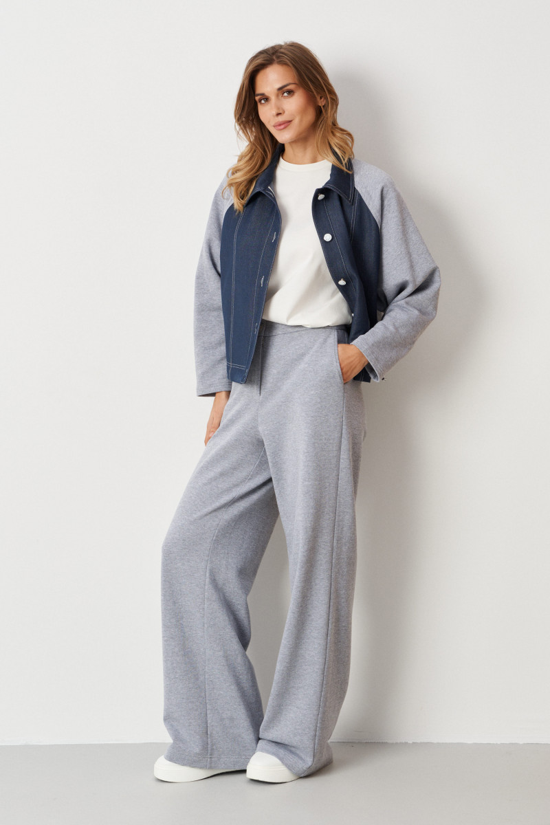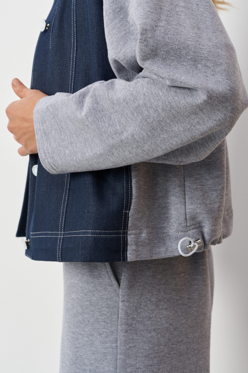Этот стильный жакет выполнен из поливискозной джинсовой ткани с дополнительными вставками из мягкого трикотажного полотна, что обеспечивает высокий уровень комфорта и современный внешний вид. Модель оформлена с центральной бортовой застежкой на обметанные петли, с джинсовыми пуговицами, что придает образу аккуратность и классический шарм. Передняя часть украшена двумя вертикальными рельефами, внутри которых спрятаны потайные карманы, добавляющие функциональности и интересной детализации. Горловина обработана рубашечным воротником, создавая элегантный силуэт, а рукава реглан обеспечивают свободное движение и комфорт при носке. В задней части жакета, а также в области передних рельефов расположена вставленная резинка, которая регулирует облегание и подчеркивает фигуру. Благодаря сине-серому оттенку, этот жакет является универсальным дополнением как к повседневным, так и к деловым образам, отлично сочетается с различными топами и аксессуарами, позволяя создавать гармоничный и стильный лук.