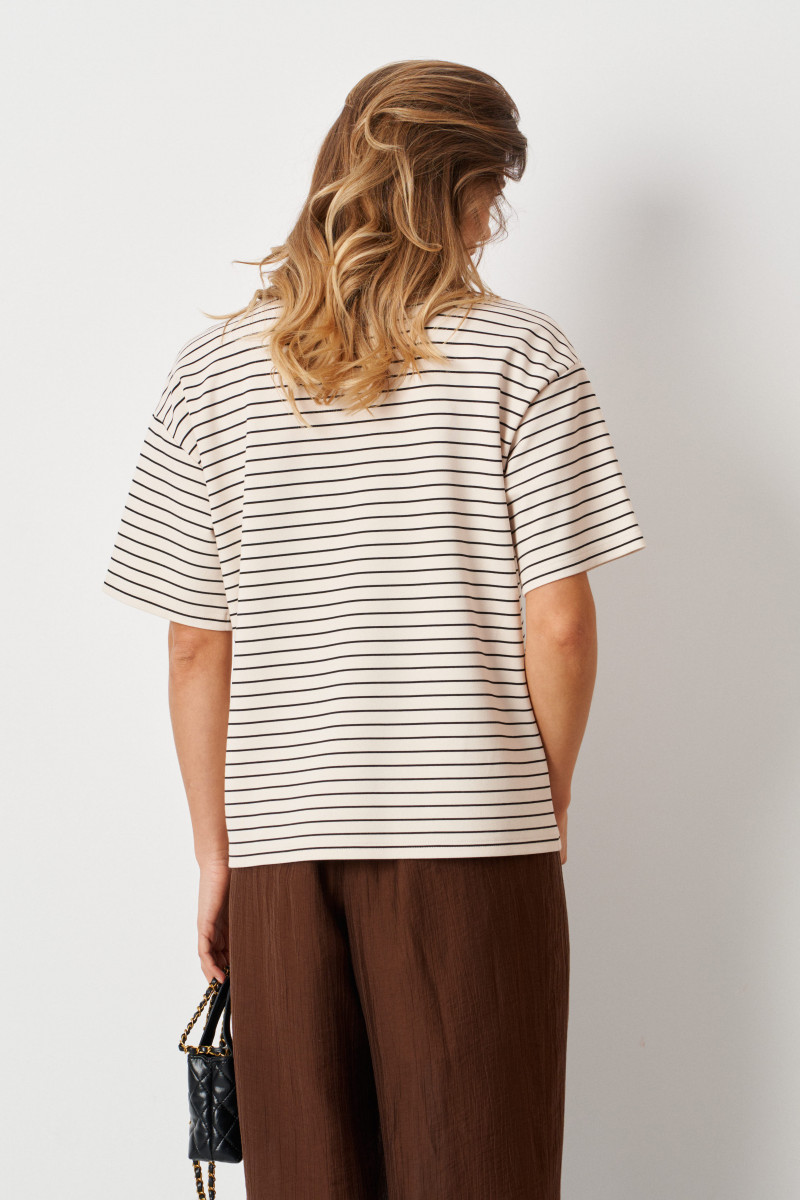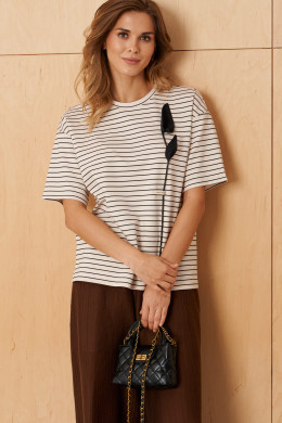 Женский джемпер из поливискозного трикотажного полотна с изящным полосатым рисунком. Модель выполнена в прямом силуэте, что обеспечивает универсальность и легкость в сочетании с различными вещами. Передняя часть украшена декоративным элементом с блестящим шнуром в форме стебля, что придает образу яркий и оригинальный акцент. Горловина обработана окантовочной тесьмой, что подчеркивает аккуратность и завершенность дизайна. Линия плеча спущена, что создает более расслабленное и свободное ощущение при ношении, а рукава втачные длиной чуть ниже локтя делают модель особенно комфортной и актуальной. Молочный оттенок джемпера делает его универсальным и легким для сочетания с разными цветами и стилями. Такой джемпер отлично подойдет для повседневного образа, добавив нотки элегантности и уютности.