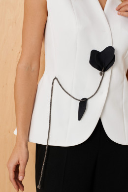 Этот женский жилет выполнен из высококачественной поливискозной костюмной ткани в мягком молочном оттенке, что придает ему элегантность и универсальность. Модель имеет полуприлегающий силуэт, мягко подчёркивающий фигуру, и отличается стильным и современным дизайном. Передняя часть украшена вертикальными рельефами, которые начинаются от плечевых швов и продолжаются до нижней линии, а также от пройм до низа, создавая эффект стройности и изящества. Спинка выполнена с средним швом и дополнена своими рельефами, идущими от плечевых швов и проймы к низу, что обеспечивает хорошую посадку и форму. В оформлении использована центральная бортовая застежка на потайные кнопки, что позволяет носить жилет как в классическом, так и в более повседневном стиле. Воротник V-образной формы придает образу женственности и утонченности. Внутри жилет полностью на подкладкладке, выполнен из поливискозной ткани, что обеспечивает комфорт и приятное ощущение при носке. Особое украшение — декоративная булавка в виде изысканного цветка, выполненного с блестящим шнуром и лепестком, которая добавляет образу нотки нежности и индивидуальности. Такой жилет отлично подойдет для создания стильных деловых образов, свиданий или повседневных комплектов, при этом легко сочетается с различными брюками и юбками. Перед стиркой декор рекомендуется снять.