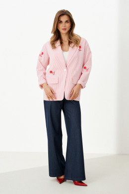 Этот женский жакет выполнен из костюмной ткани с добавлением хлопка, что делает его одновременно элегантным и приятным к телу. Жакет на качественной хлопковой подкладке. Модель имеет центральную бортовую застежку на обметанную петлю и одну пуговицу, обеспечивая удобство и аккуратность посадки. Передняя часть украшена дизайнерской вышивкой в виде цветов, которая придает изделию изысканный и нотки утонченности. На передней части также располагаются накладные клапаны, имитирующие карманы, что создает эффект обманки — элемент декоративной отделки, добавляющий интересный акцент к дизайну. Спинка жакета выполнена с центральным швом, что обеспечивает хорошую посадку и структурированность модели. Горловина обработана пиджачным воротником, придающим жакету классический стиль и эффект завершенности. Длинные втачные рукава позволяют свободно двигаться и создают аккуратный внешний вид. Жакет выполнен в бело-красном оттенке с полоской, что делает его универсальным и стильным элементом гардероба, подходящим для различных повседневных и деловых образов.
