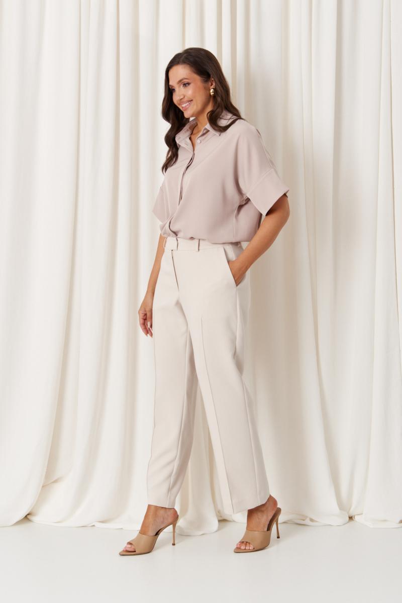Эти женские брюки выполнены из костюмной поливискозной ткани бежевого цвета, идеально подходящей для повседневных образов. Их классический крой и нейтральный оттенок делают их универсальным элементом гардероба.