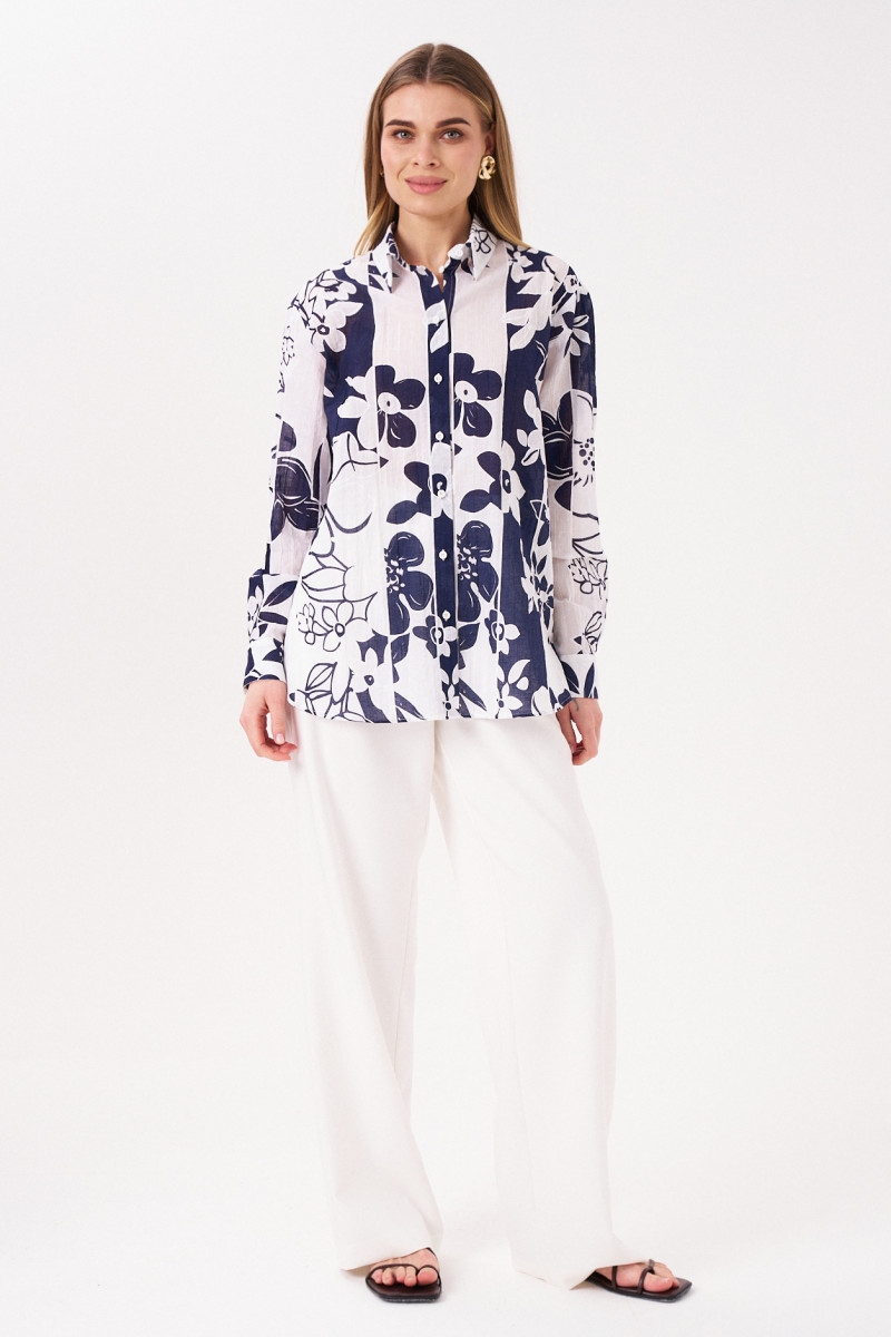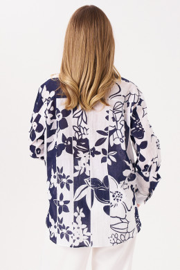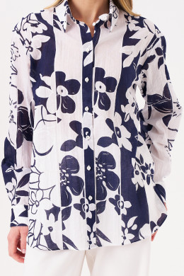 Блузка женская из хлопчатобумажной ткани для повседневной носки прямого силуэта. Застежка в блузке центральная бортовая на обметанные петли и пуговицы. Спинка имеет отрезную кокетку. Горловина обработана рубашечным воротником с отрезной стойкой. Рукава втачные длинные, низ рукава обработан притачной манжетой с застежкой на одну обметанную петлю и одну пуговицу. Стильная блузка в бело-синем оттенке, которая обязательно осчастливит вас своим чудесным видом, а главная данная блузка будет очень практичная и удобная.