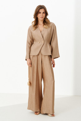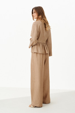 Эти женские брюки выполнены из мягкой и приятной на ощупь поливискозной ткани в насыщенном оттенке капучино. Модель прямого кроя обеспечивает комфорт и свободу движений. Верхний срез брюк обработан притачным поясом с вставкой на резинке, что делает посадку мягкой и удобной, а также позволяет легко регулировать объем. Такой дизайн делает эти брюки отличным выбором для офисных и деловых образов, при этом универсальный цвет капучино позволяет без труда сочетать их с различными топами и аксессуарами, создавая стильные и элегантные комплекты.