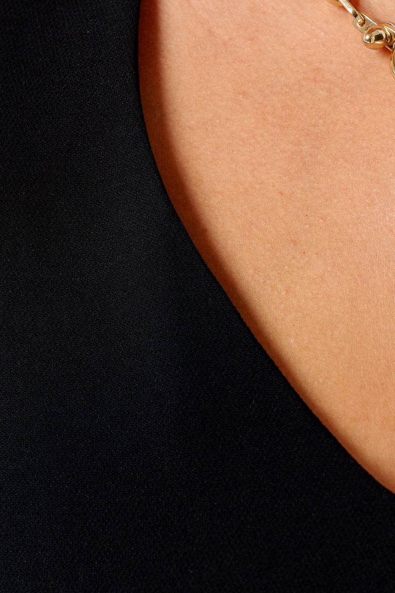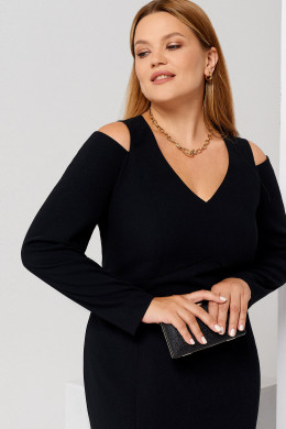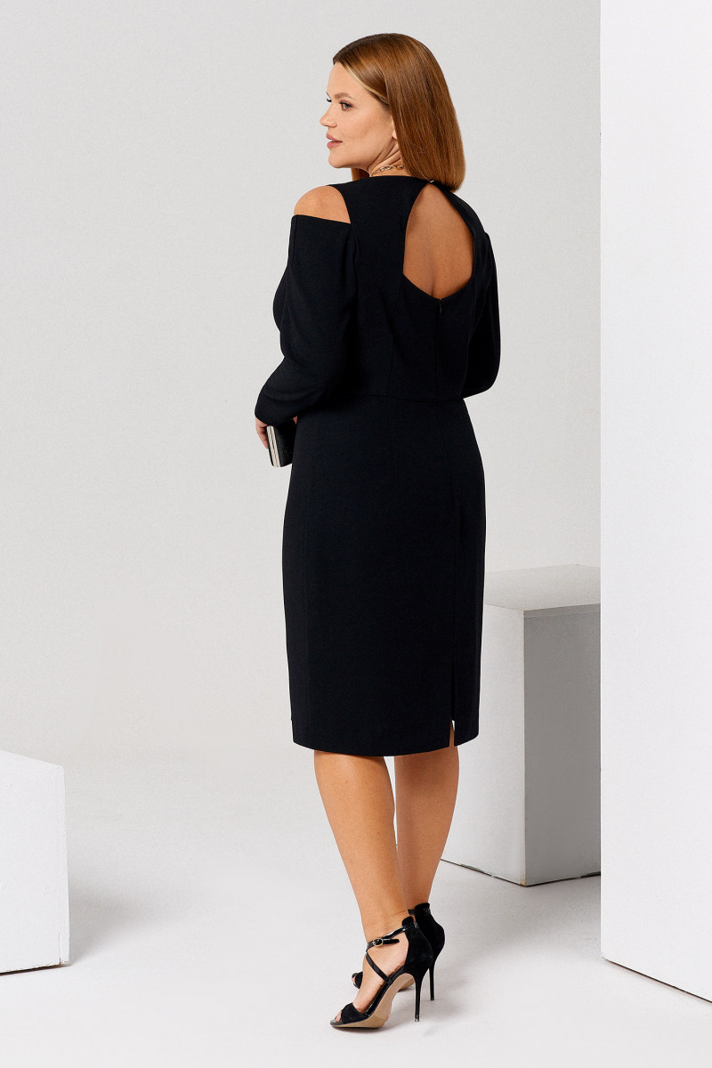 Черное платье женское - восхитительный наряд для уверенной в себе девушки, не боящейся оказаться в центре внимания. Если вы именно такая, то лаконичная модель с асимметричным вырезом создана для вас. Ее можно использовать, как платье женское офисное в комбинации с жакетом или пиджаком. В таком случае, наряд будет уместно смотреться на торжественном мероприятии и деловой встрече. Платье женское вечернее короткое имеет длину до коленей. Благодаря прямому фасону, оно не облегает тело, скрывая мелкие несовершенства силуэта. Оригинальный переход от горловины к открытому плечу пересекает широкая бретель, украшенная пряжкой. Воротник-стойка застегивается на пуговицы. Платье трикотажное женское скроено с длинными широкими рукавами, заканчивающимися манжетами. Вечернее платье из мягкого трикотажа дарит приятные тактильные ощущения. Вы можете заказать новогоднее платье женское, чтобы продемонстрировать окружающим свой утонченный вкус.