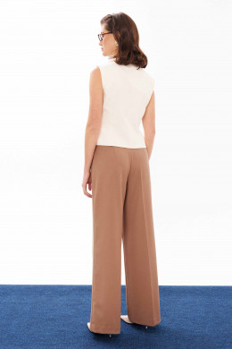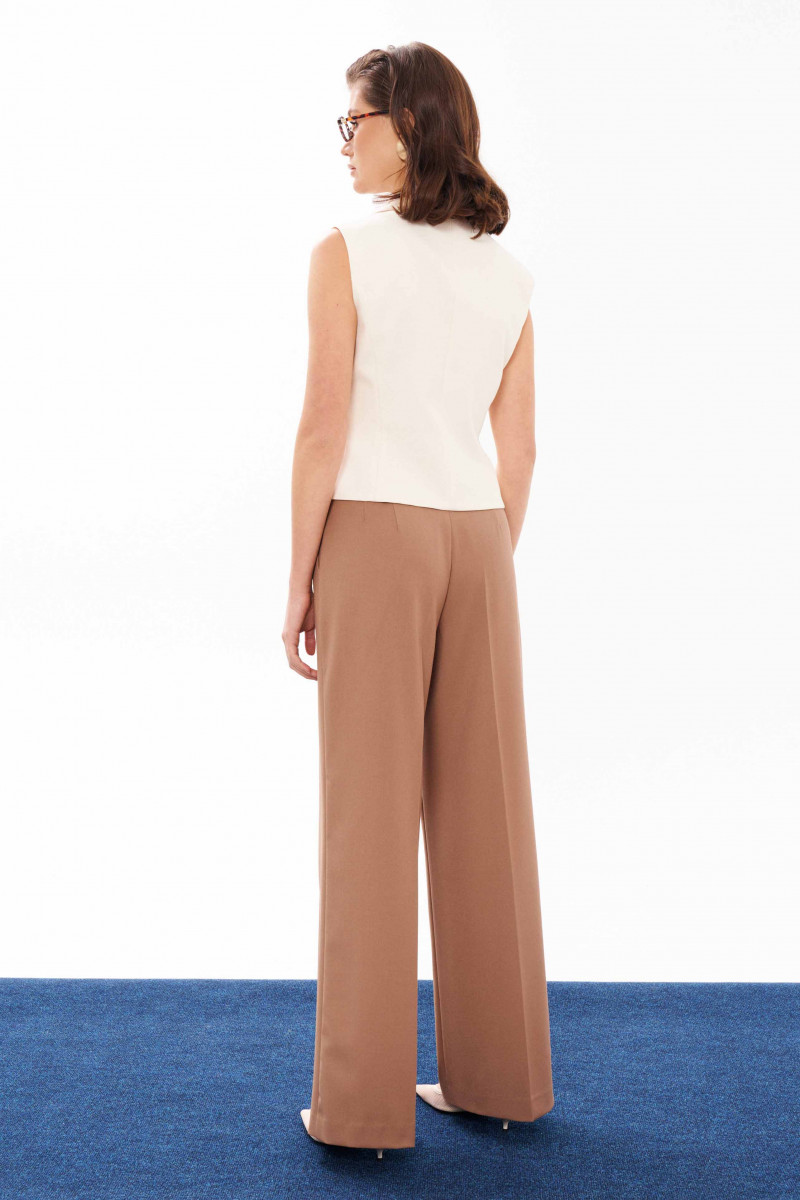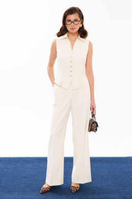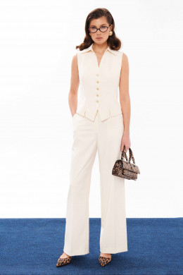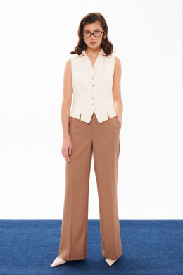 Жилетка женская из смесовой ткани полуприлегающего силуэта для повседневной и деловой носки. Застежка в жилете центральная бортовая на пять обметанных петель и пять пуговиц. Перед имеет два вертикальных рельефа идущих от линии плеча до низа изделия с небольшими разрезами к низу. Спинка имеет средний шов и два рельефа идущих от проймы до линии низа. Горловина обработана рубашечным воротником с отрезной стойкой. Жилет без рукавов. Жилет на поливискозной подкладке. Стильный жилет, который станет вашим любимцем, в нем вы будете чувствовать себя увереннее и привлекательнее.