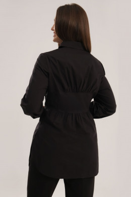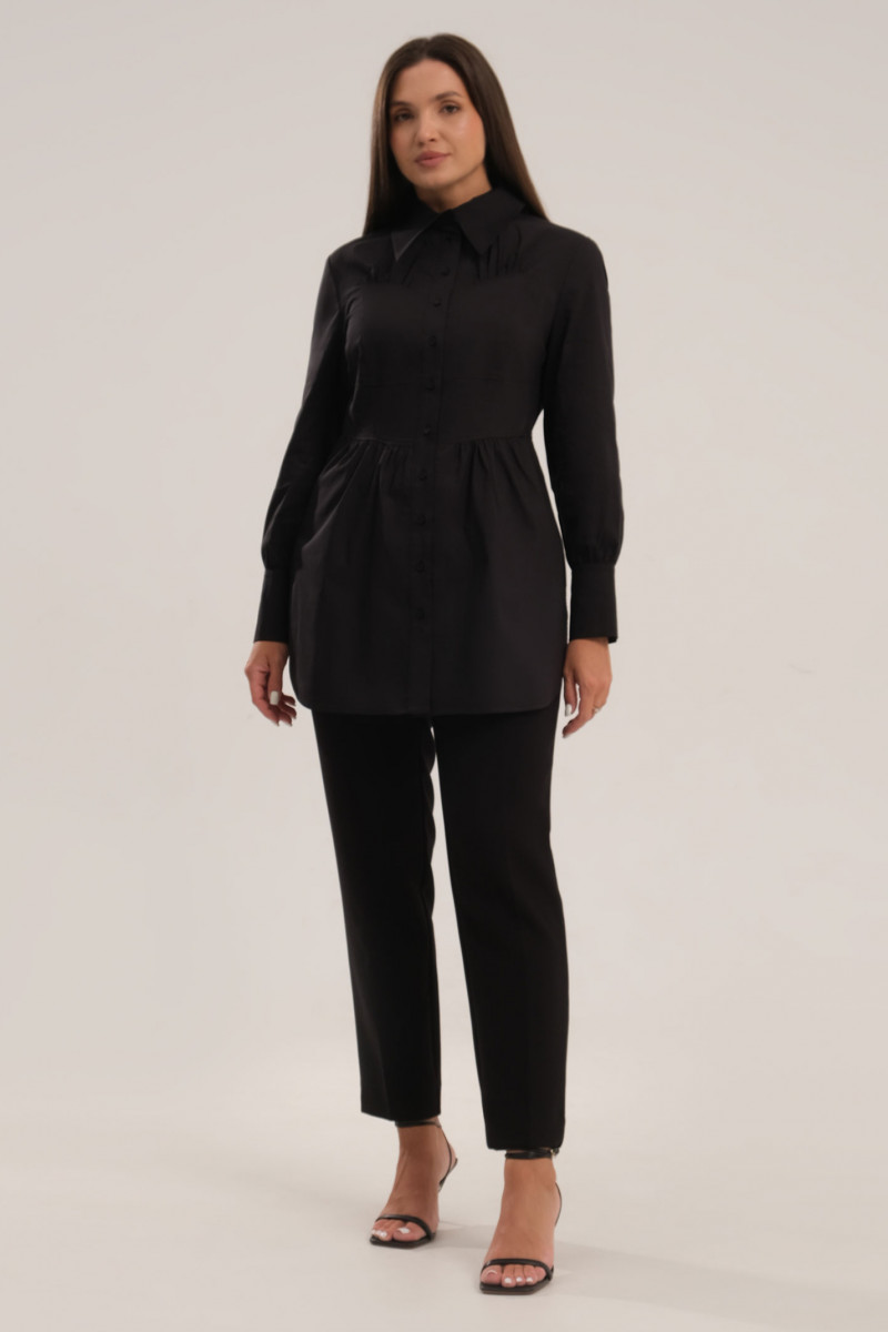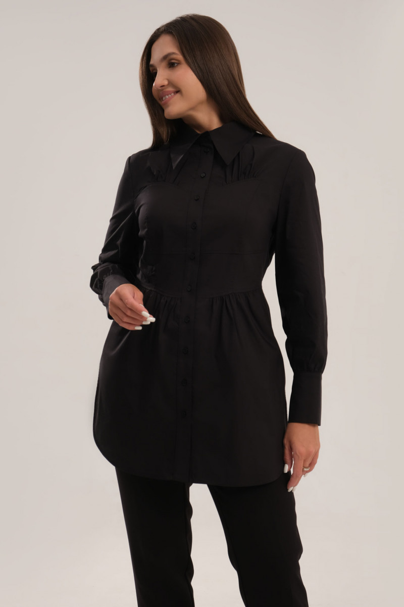 Деловая блузка рубашка универсального белого цвета – незаменимая вещь в базовом гардеробе. С ее помощью вы создадите элегантные сеты с юбкой-карандашом, классическими брюками для офиса, работы, учебы. Удлиненная модель выглядит стильно, подходит для повседневной носки и особого случая. Блузка с длинным рукавом на широких манжетах, имеет рубашечный крой. Он проявляется в отложном воротнике и пуговицах по планке. Центральная часть изделия слегка приталенная, имитирующая декольтированный корсет с защипами по верхнему фигурному и нижнему краям. Блуза сшита из хлопкового трикотажа. Вы можете выбрать и купить недорогую нарядную блузу в подходящем размере для праздников, корпоративов, деловых встреч.