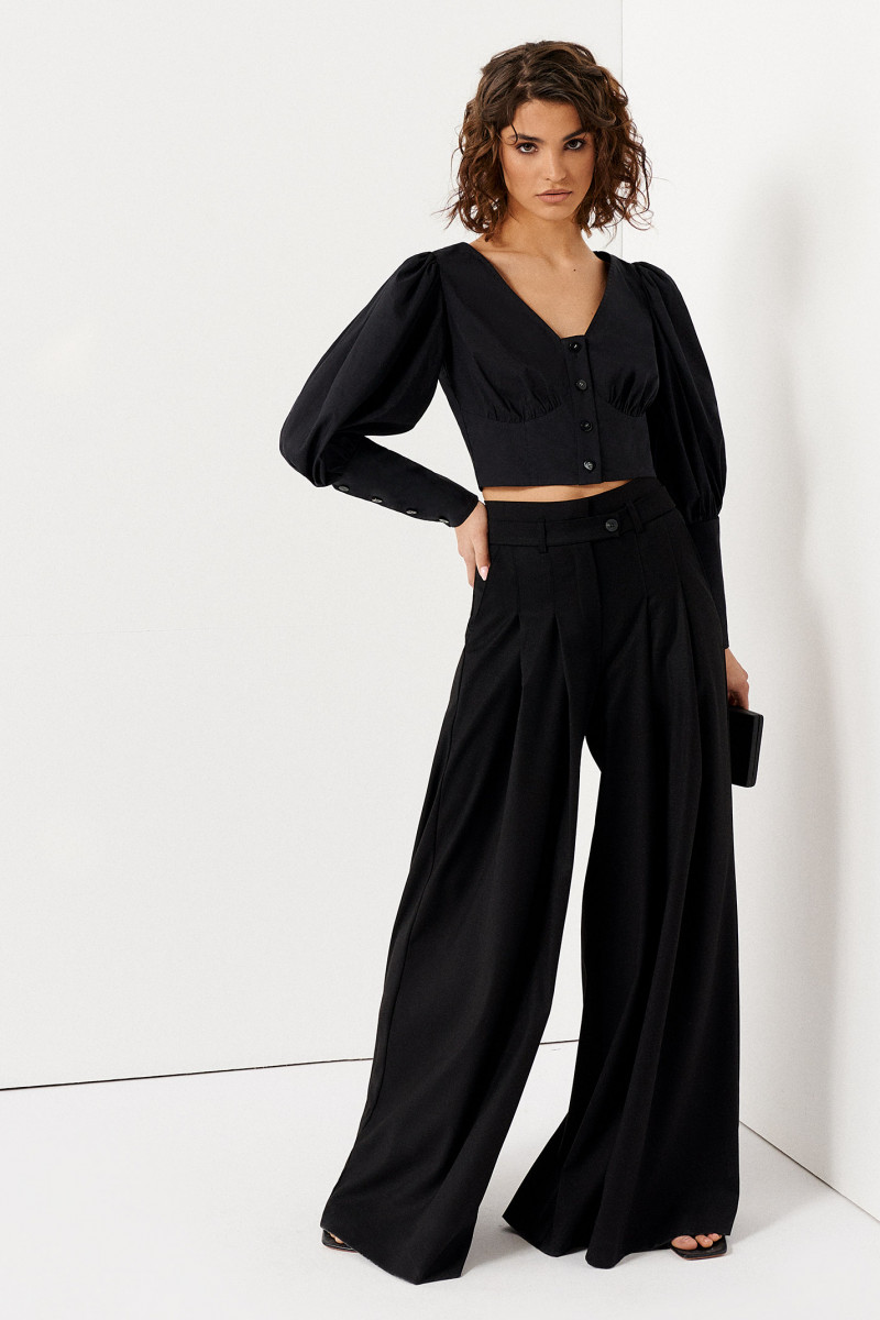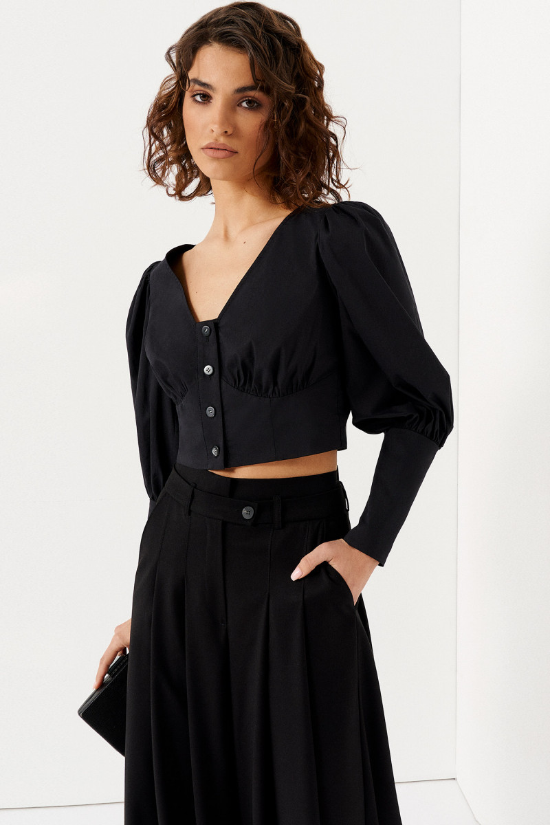 Молодежная блузка с оригинальным дизайном идеально подходит для создания стильных, смелых повседневных и вечерних образов. Однотонная укороченная модель сочетается с юбками, брюками-клеш, кюлотами, зауженными джинсами любых расцветок. Блузка на пуговицах создана с глубоким V-образным вырезом горловины. Привлекает внимание длинный пышный втачной рукав, оканчивающийся широким манжетом на застежках петлях-пуговицах. Верхняя часть лифа – отрезная, фигурная. Нижняя – имитирует корсет. Для пошива изделия используется приятный хлопковый трикотаж, поэтому в женской блузе комфортно. Спешите купить модную блузку, которая подарит вашим образам легкую экстравагантность и яркую индивидуальность. Доступные размеры – 42-48.