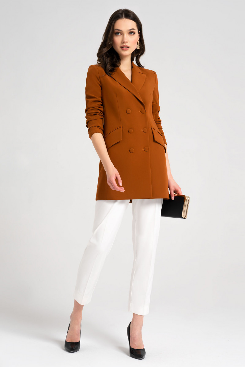 Создать стильный, элегантный , свободный образ поможет эффектный жакет, из поливискозной ткани. Жакет свободного силуэта, удлиненный, застежка двухбортная, с рельефными швами, передними талиевыми вытачками и боковыми прорезными карманами с клапаном и листочками. Спинка с рельефными и талиевыми вытачками.Рукава втачные , длинные. Шикарный образ жакета, как по случаю так и без него.