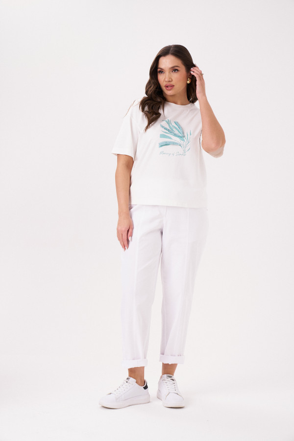 Джемпер женский из смесового трикотажного полотна для повседневной носки. Перед имеет дизайнерскую печать в виде листков с надписью и декором из джинса в виде бахромы. Горловина чуть расширена. Линия плеча спущена. Рукава втачные длиной чуть ниже локтя. Стильный джемпер, в котором вы обязательно будете смотреться модно. Данный джемпер будет очень удобный в носке, а за счет большого содержания вискозы джемпер будет приятен к телу.