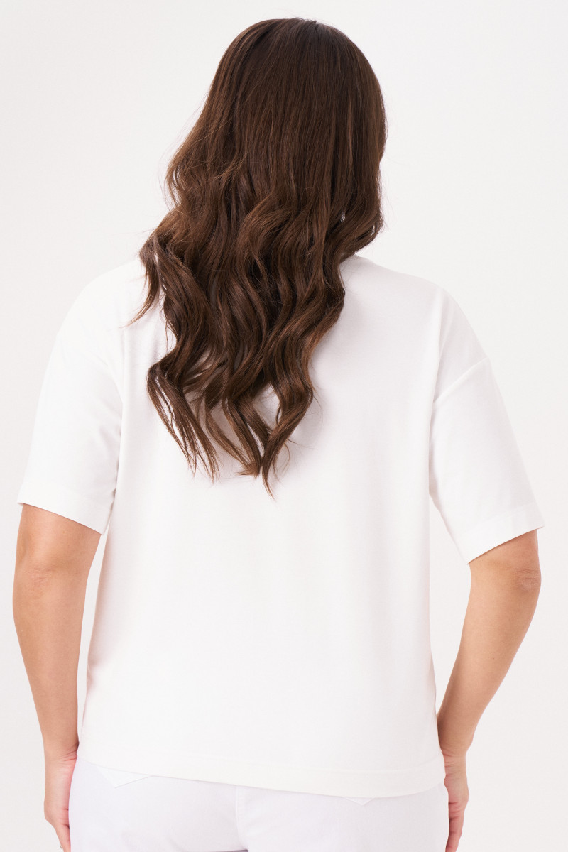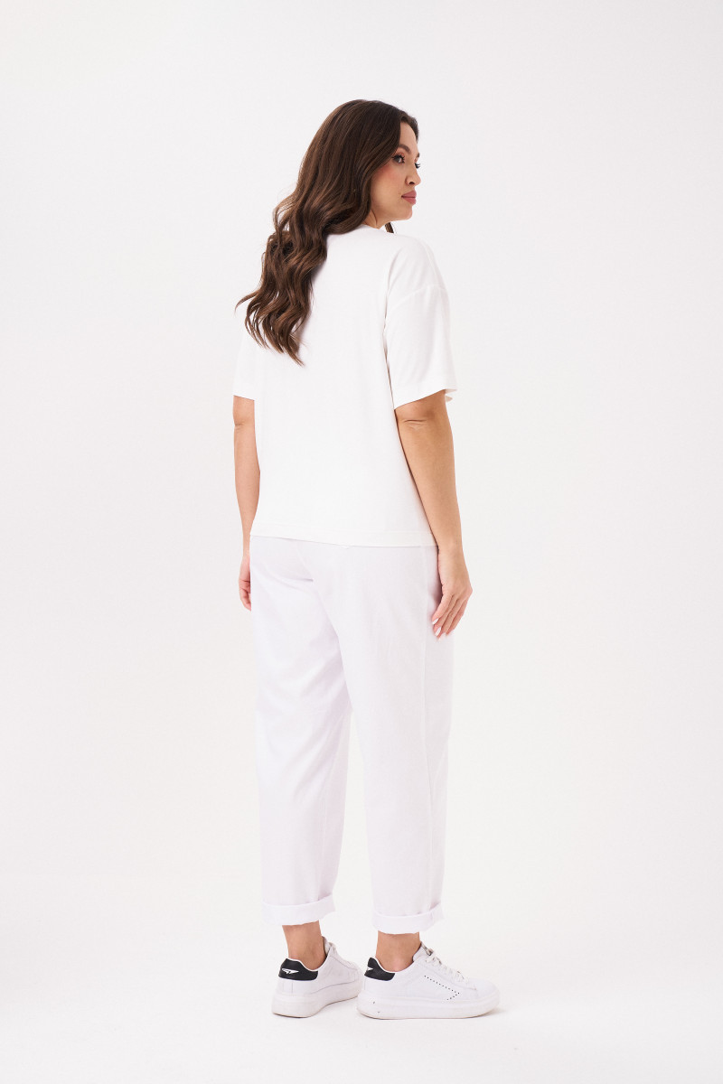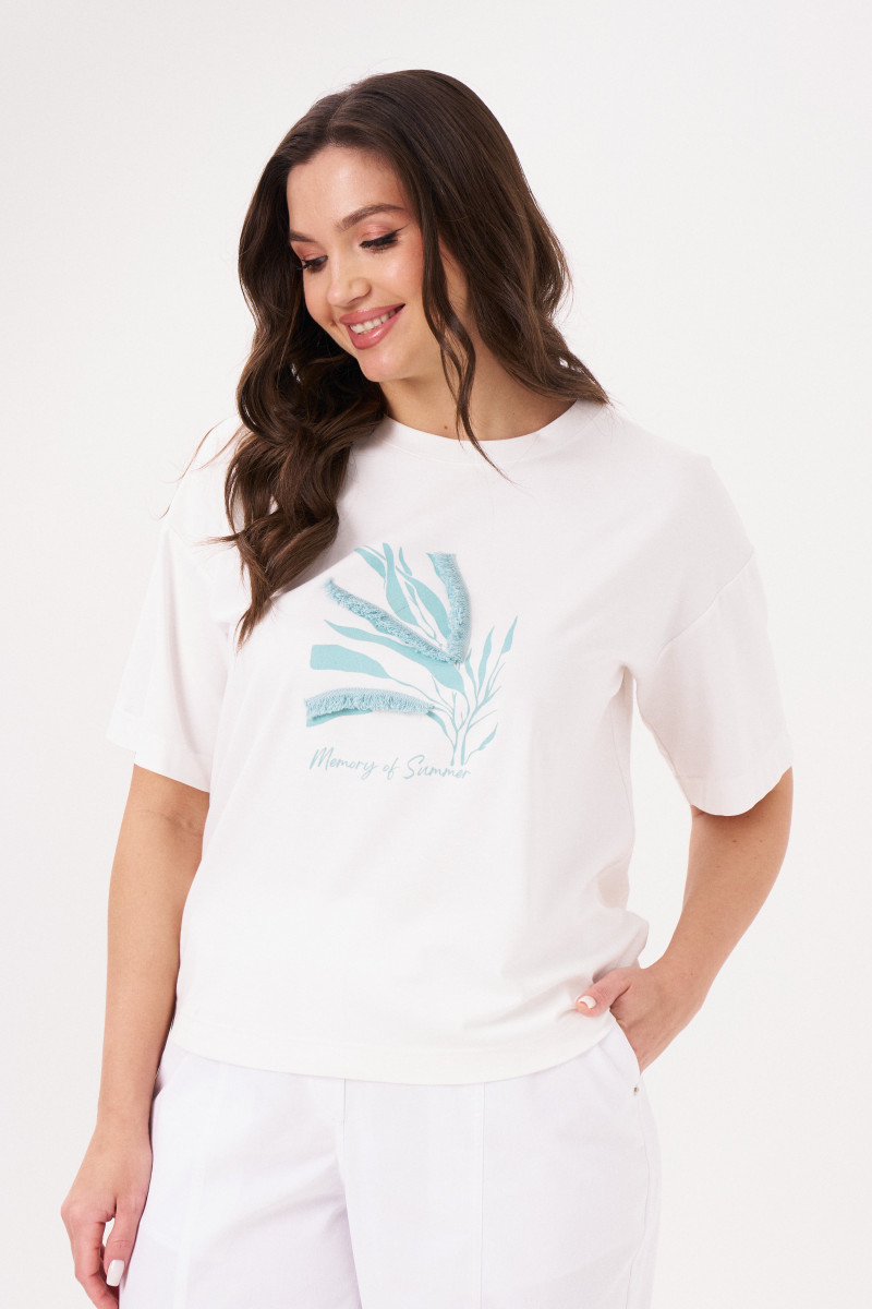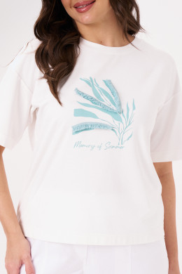 Джемпер женский из смесового трикотажного полотна для повседневной носки. Перед имеет дизайнерскую печать в виде листков с надписью и декором из джинса в виде бахромы. Горловина чуть расширена. Линия плеча спущена. Рукава втачные длиной чуть ниже локтя. Стильный джемпер, в котором вы обязательно будете смотреться модно. Данный джемпер будет очень удобный в носке, а за счет большого содержания хлопка джемпер будет приятен к телу.