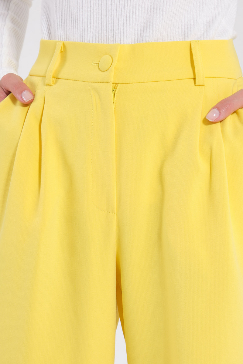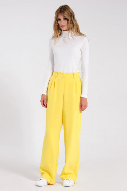 Однотонные брюки женские классические клеш пошиты из приятной на ощупь, плотной поливискозной ткани. Особенности их кроя: высокая посадка, свободный фасон, прорезные карманы в боковых швах, складки и стрелки от пояса, шлевки для ремня, застежка-молния и пуговица.