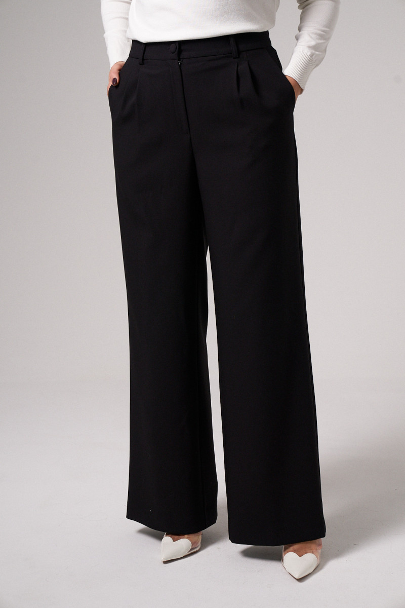 Однотонные брюки женские классические клеш пошиты из приятной на ощупь, плотной поливискозной ткани. Особенности их кроя: высокая посадка, свободный фасон, прорезные карманы в боковых швах, складки и стрелки от пояса, шлевки для ремня, застежка-молния и пуговица.