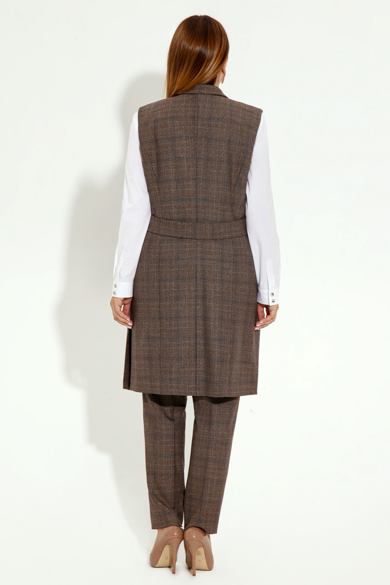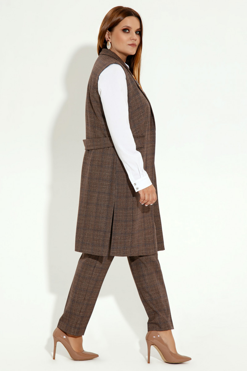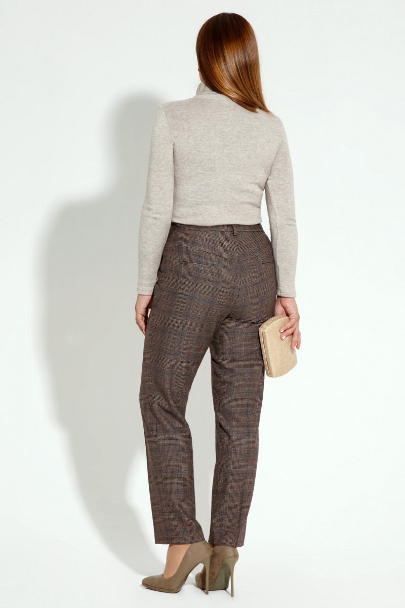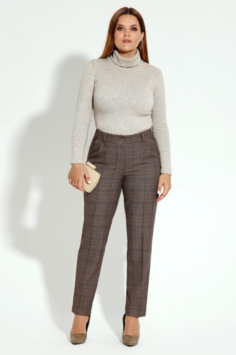Стильные брюки модного, приближенного к классическому силуэту, выполнены приятной костюмной эластичной ткани. Пояс на талии отрезной. Карманы с косыми входами в боковых швах и вертикальные защипы от верхнего среза. Застёжка спереди на молнию с гульфиком и петлю-пуговицу на поясе. По спинке в пояс вставлена широкая резинка,которая обеспечивает чувство комфорта и идеальное прилегание брюк в области талии.По спинке выполнена отрезная кокетка фигурной формы и декоративные листачки. Брюки длинные и выглядят очень стильно. Прекрасный вариант брюк на каждый день в офис .