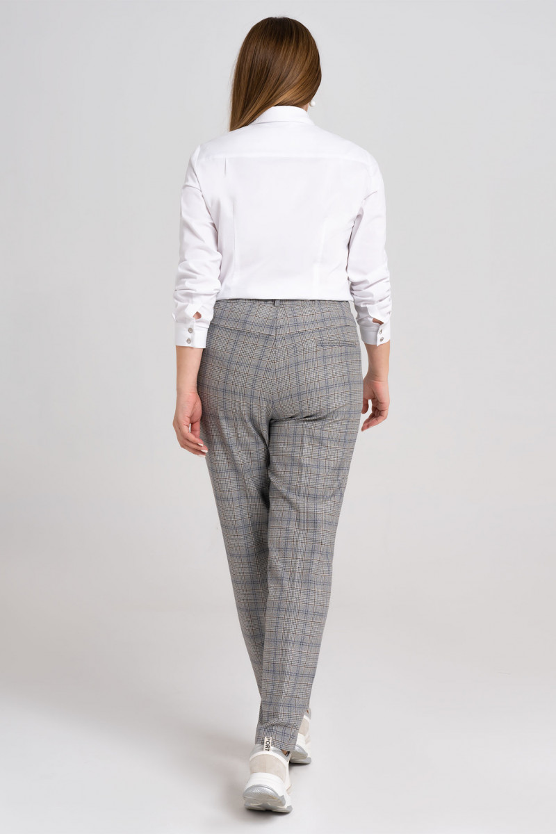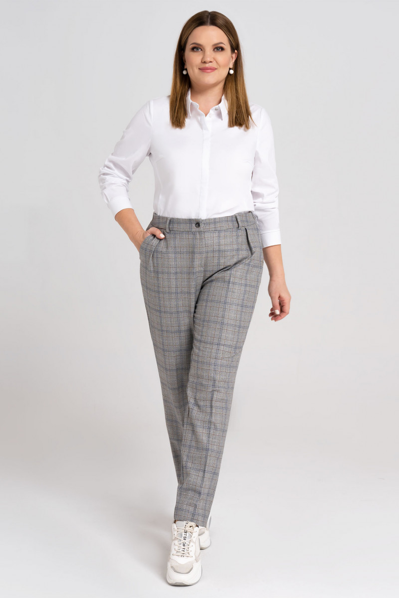 Стильные брюки модного, приближенного к классическому силуэту, выполнены приятной костюмной эластичной ткани. Пояс на талии отрезной. Карманы с косыми входами в боковых швах и вертикальные защипы от верхнего среза. Застёжка спереди на молнию с гульфиком и петлю-пуговицу на поясе. По спинке в пояс вставлена широкая резинка,которая обеспечивает чувство комфорта и идеальное прилегание брюк в области талии.По спинке выполнена отрезная кокетка фигурной формы и декоративные листачки. Брюки длинные и выглядят очень стильно. Прекрасный вариант брюк на каждый день в офис .