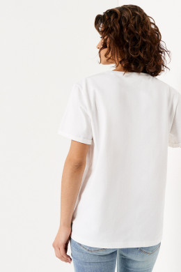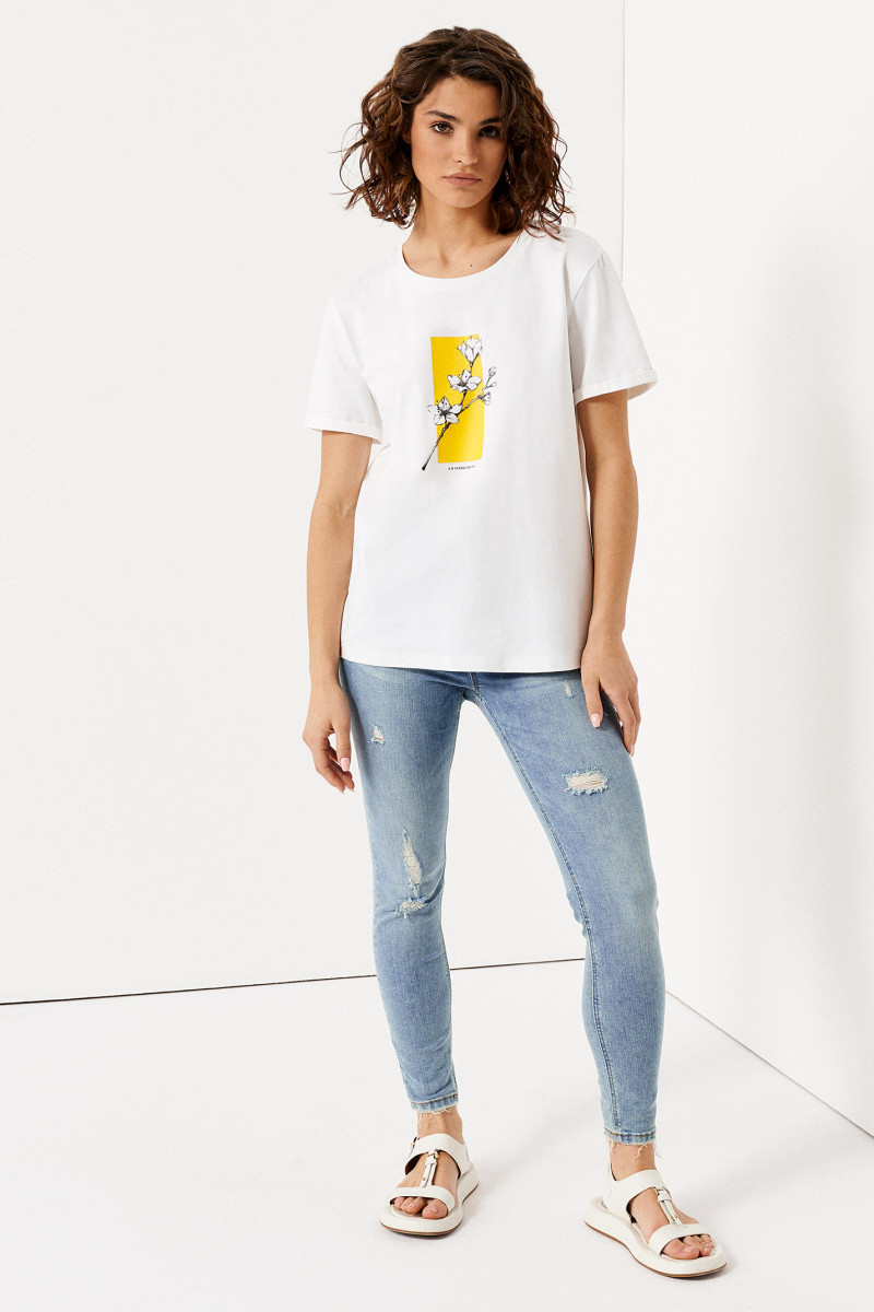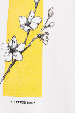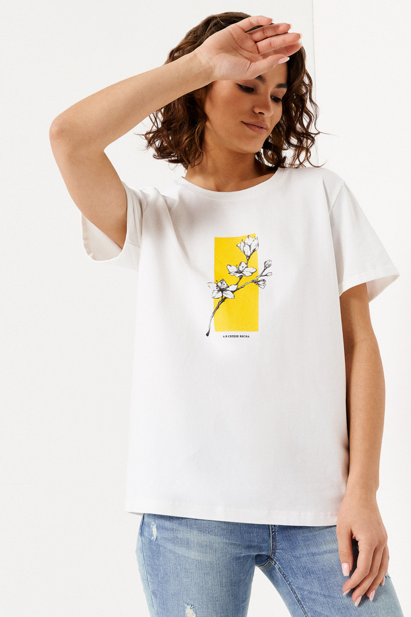 Нарядная футболка легко заменит надоевшую блузку и станет неотъемлемой частью эффектных повседневных образов. Модель молочного цвета гармонично впишется в дуэт с джинсами, шортами, юбкой, брюками. Изделие изготовлено в прямом силуэте. Детали говорят сами за себя: втачной короткий рукав свободного кроя, круглая горловина. Благодаря простому, но благородному дизайну, изделие выгодно подчеркнет вашу фигуру. Белая хлопковая футболка длиной до линии бедра спереди украшена ярким рисунком и подписью на весеннюю тематику. Чтобы выглядеть стильно весенне-летний сезон, заказывайте модный джемпер с принтом, доступный в размерах 42-50.