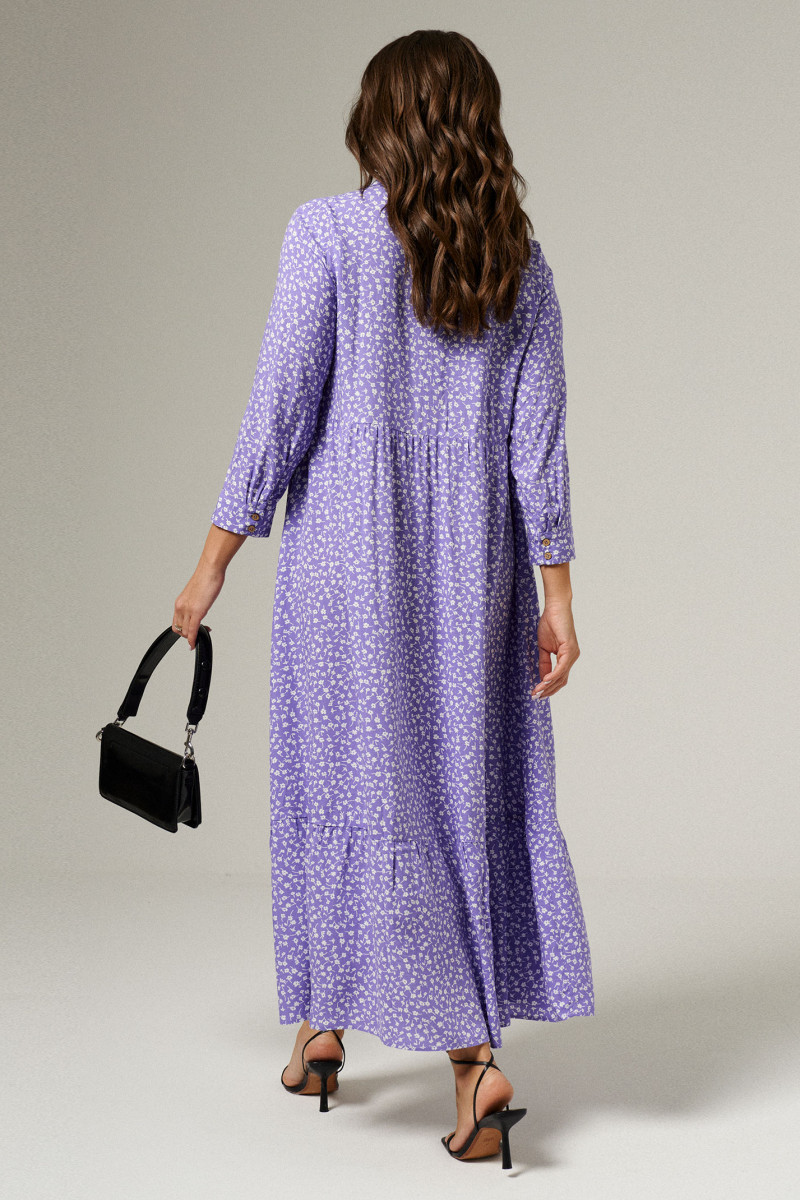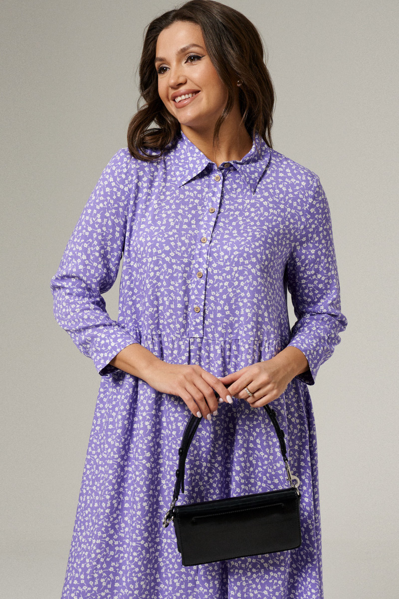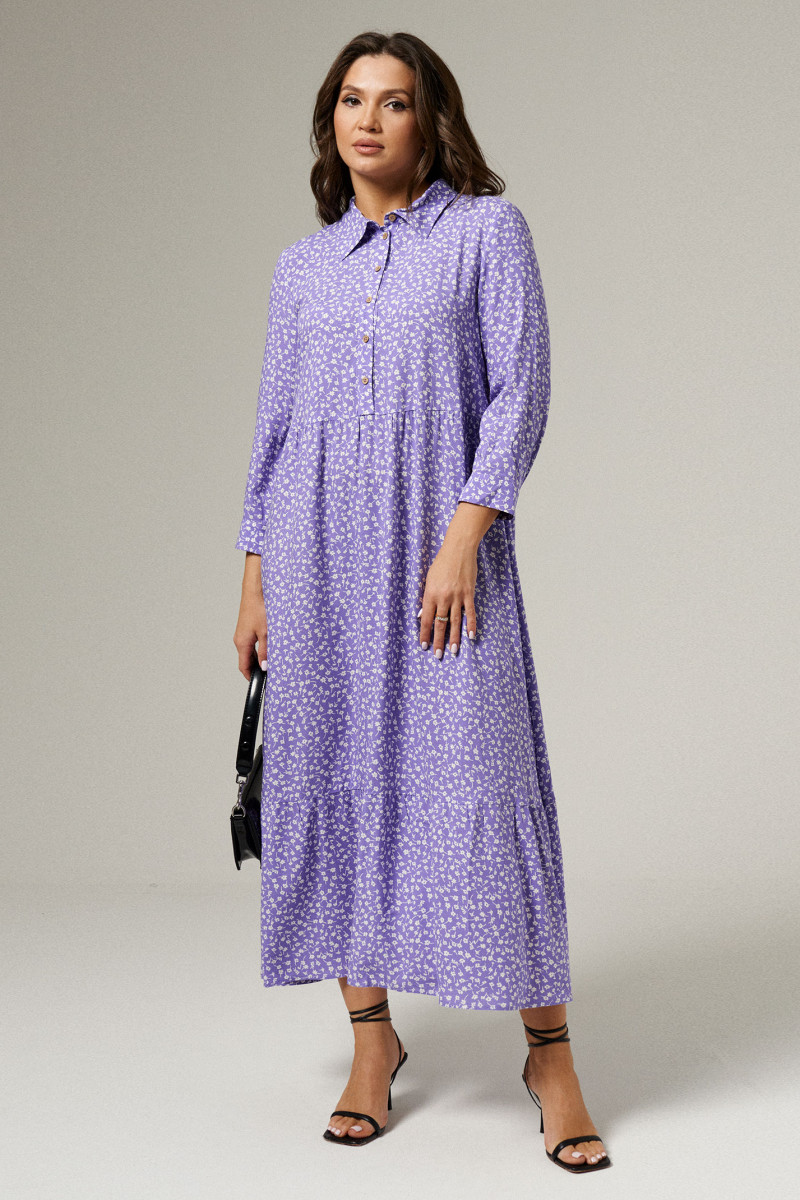 Платье из вискозной ткани для повседневной носки. Изделие А- силуэта, отрезное по талии. Рукав укороченный втачной ооформлен притачной манжетой застегивоющейся на пуговицу. Воротник- стойка. Фронтальная застежка на пуговицы до талии. Длина изделия до середины голени.