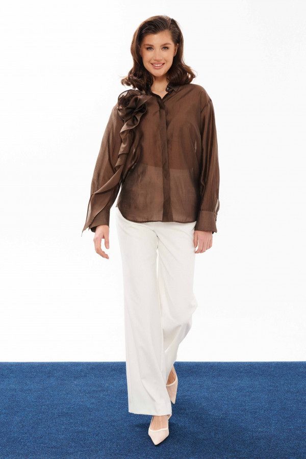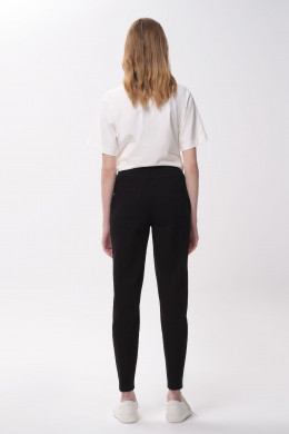 Брюки женские прямые из смесовой ткани для повседневной носки. Верхний срез брюк обработан притачным поясом со вставкой на резинке в боковой и задней части брюк, застежка на одну обметанную петлю и одну пуговицу, а также имеется застежка на тесьму-молнию в среднем шве брюк. Задняя часть брюк с кокеткой и двумя накладными карманами. В брюках расположен в боковом шве карман с подкройным бочком. Отличный классический вариант брюк, которые будут гармонично смотреться под любые изделия.
