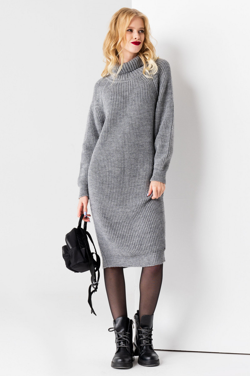 Вязаное платье длиной до коленей с длинными рукавами с широкими манжетами. Модель выполнена из мягкой пряжи на сочетании шерсти и акрила. Воротник - высокая стойка с отворотом.Модель фасона платья подразумевает свободную посадку. Такое лаконичное теплое платье легко разбавить различными аксессуарами, создавая разнообразные осенние образы.