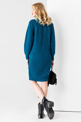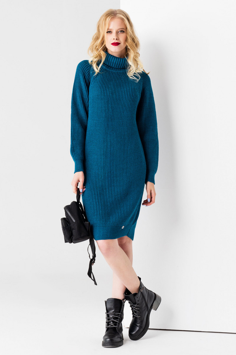 Вязаное платье длиной до коленей с длинными рукавами с широкими манжетами. Модель выполнена из мягкой пряжи на сочетании шерсти и акрила. Воротник - высокая стойка с отворотом.Модель фасона платья подразумевает свободную посадку. Такое лаконичное теплое платье легко разбавить различными аксессуарами, создавая разнообразные осенние образы.