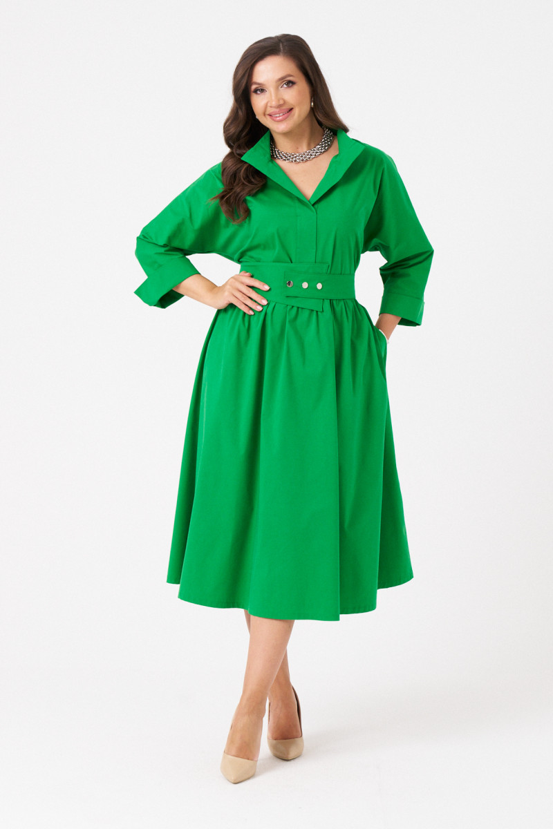 Платье женское из хлопковой ткани для повседневной носки. Без подкладки. Платье полуприлегающего силуэта. Длина изделия ниже колена. В боковых швах прорезные карманы. Рукав три четверти с манжетой. Платье укомплектовано поясом из основной ткани изделия.