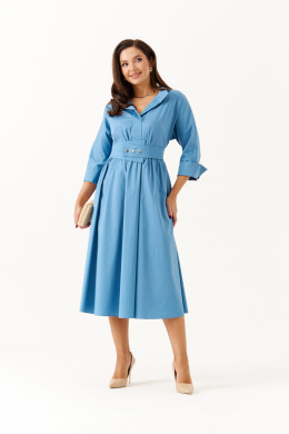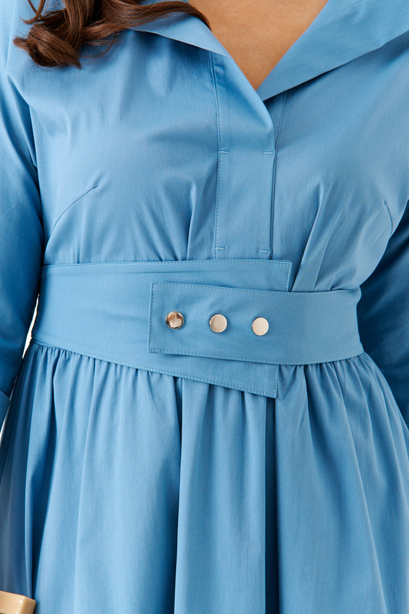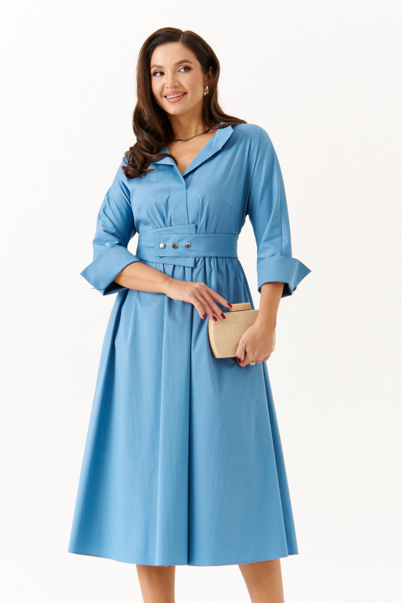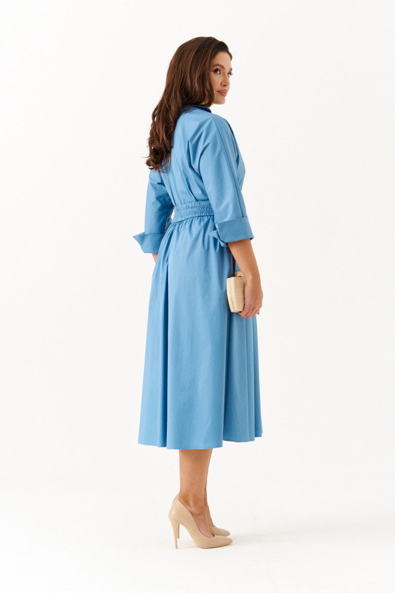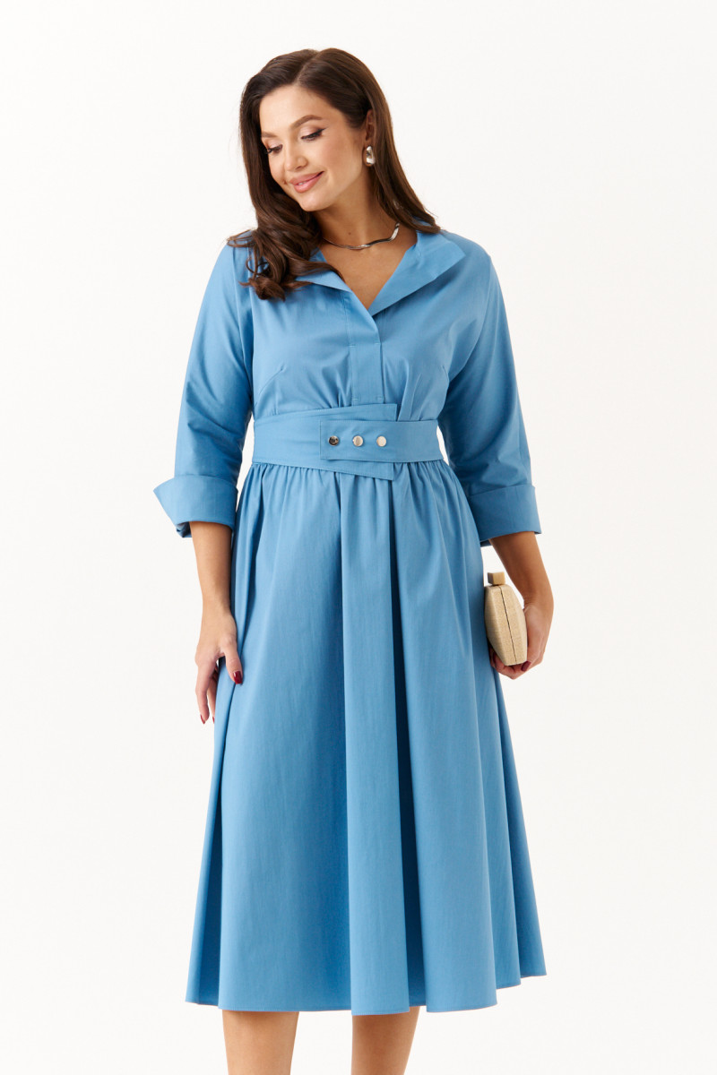 Платье женское из хлопковой ткани для повседневной носки. Без подкладки. Платье полуприлегающего силуэта. Длина изделия ниже колена. В боковых швах прорезные карманы. Рукав три четверти с манжетой. Платье укомплектовано поясом из основной ткани изделия.