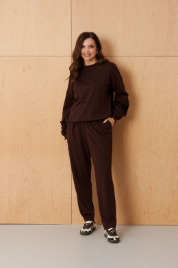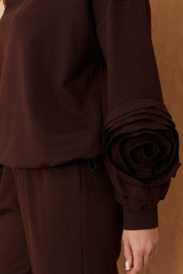 Этот женский джемпер выполнен из поливискозного трикотажного полотна и предназначен для повседневной носки. Модель обладает прямым силуэтом, обеспечивающим комфорт и универсальность. Низ изделия обработан притачным поясом, который подчеркивает линию талии и придает образу завершенность. Круглая горловина и спущенная линия плеча создают мягкий и современный силуэт. Длинные втачные рукава с низом, обработанным притачной манжетой, обеспечивают удобство и стильный внешний вид. Особенностью дизайна являются роскошные тканевые цветы, расположенные на низу рукавов, что придает джемперу особую изюминку и элегантность. Модный шоколадный оттенок делает этот джемпер ярким и привлекательным элементом гардероба. Он безусловно станет вашим фаворитом — в нем вы будете чувствовать себя комфортно и выглядеть модно и стильно.