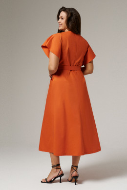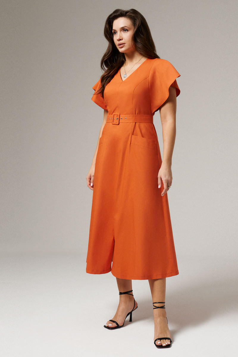 Платье приталенного силуэта с поясом, рельефами по переду и V-образной горловиной. Также на передней части платья два кармана с клапанами, средний шов, заканчивающийся встречной складкой. Спинка со средним швом, в котором находится молния, и двумя талиевыми вытачками. Рукав-объёмная рюша, входящая в пройму.