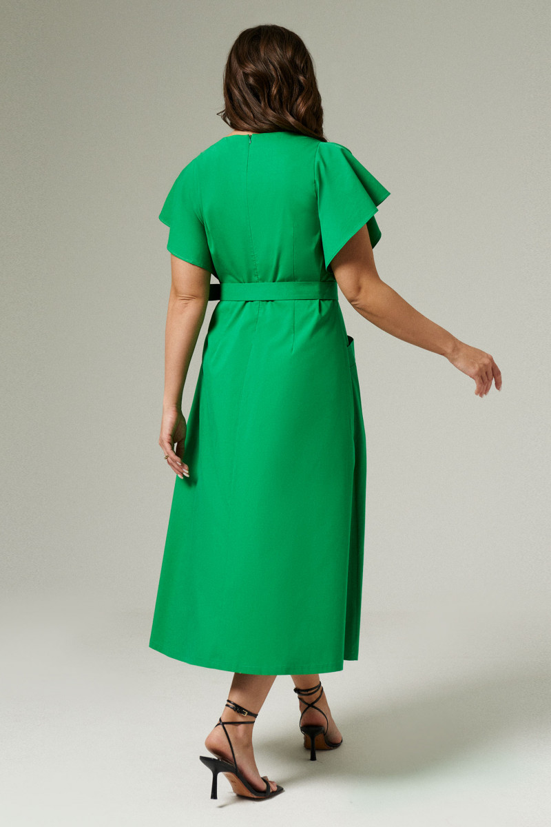 Платье приталенного силуэта с поясом, рельефами по переду и V-образной горловиной. Также на передней части платья два кармана с клапанами, средний шов, заканчивающийся встречной складкой. Спинка со средним швом, в котором находится молния, и двумя талиевыми вытачками. Рукав-объёмная рюша, входящая в пройму.