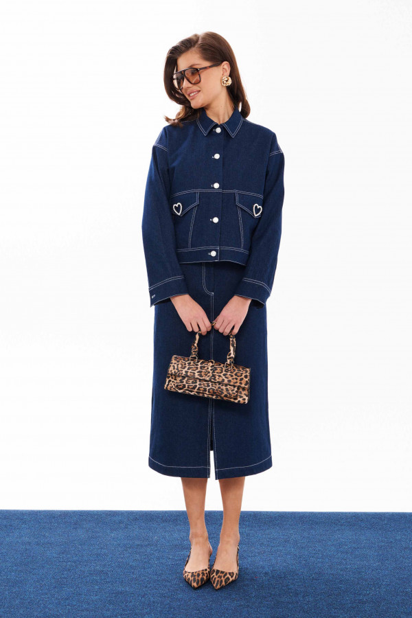 Жакет женский из смесовой джинсовой ткани для повседневной носки. Жакет прямого силуэта. Застежка в жакете центральная бортовая на обметанные петли и пуговицы. Перед имеет отрезную кокетку по переду и два фигурных накладных кармана с клапаном, на клапане имеется декоративная брошь в виде очаровательного сердечка. Спинка с отрезной кокеткой. Низ жакета обработан притачным поясом. Горловина обработана рубашечным воротником. Рукава втачные длинные, низ рукава обработан притачной манжетой с застежкой на обметанные петли и пуговицы. Жакет имеет отделочные строчки по воротнику, кокетке, карману, клапану, поясу, по пройме и плечу. Очень модный жакет, в котором вы обязательно почувствуете себя уверенной и очень красивой. Данный жакет станет одной из любимейших вещиц в вашем гардеробе.