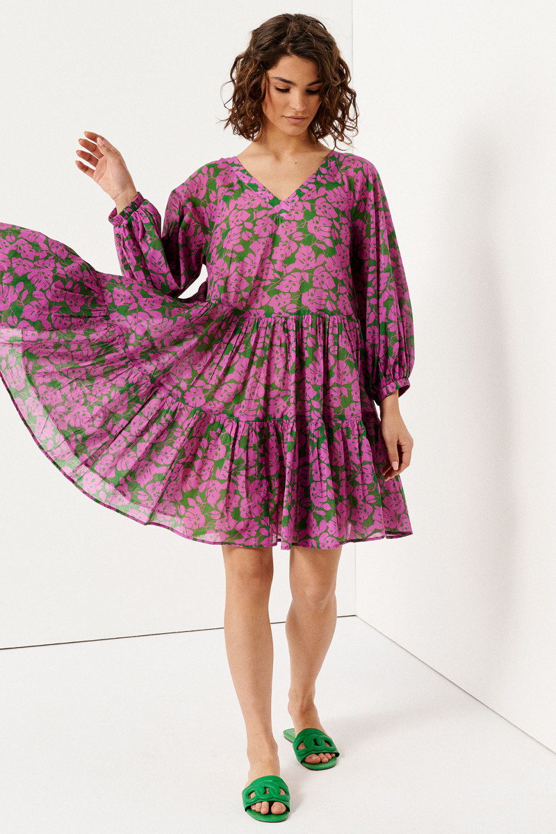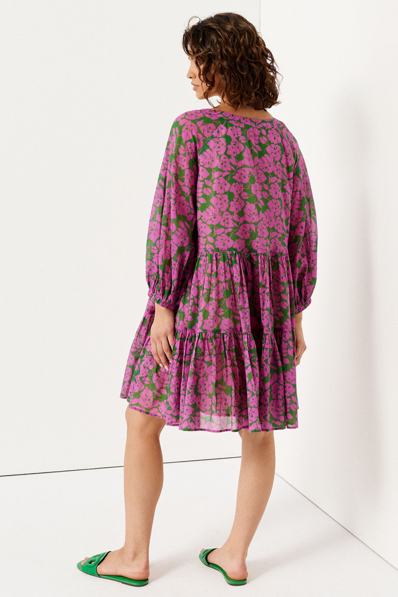 Платье женское из хлопковой лёгкой ткани для повседневной носки. Изделие на вискозной подкладке. Платье, расширяющееся к низу, имеет два присбореных волана. Длина выше колена. Горловина с V-образным вырезом. Рукав 7/8 по низу манжет с резинкой.Ткань имеет принт с цветочным мотивом.