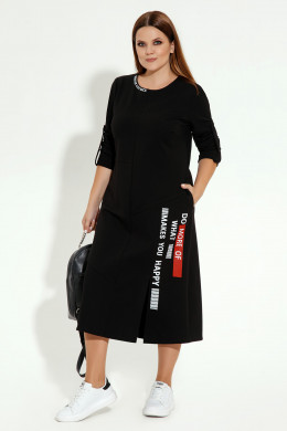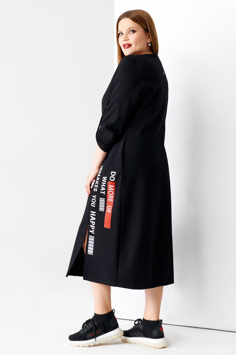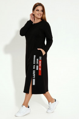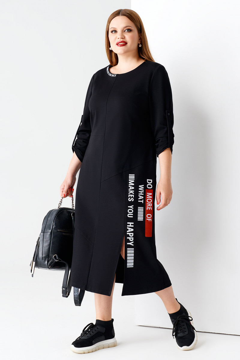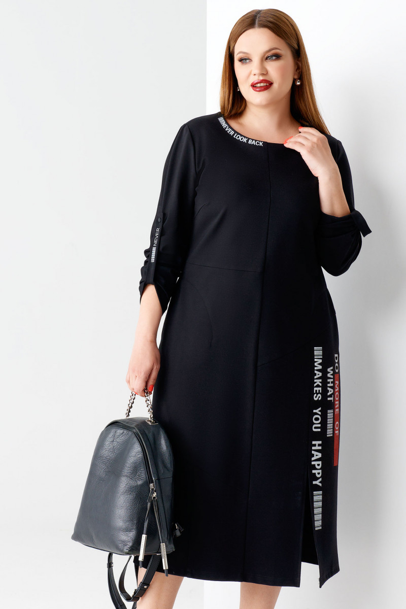 Платье женское больших размеров скроено с округлой горловиной и оригинально собранными рукавами длиной ¾. Платье длинное красиво приоткроет ваши щиколотки, а высокий разрез покажет стройность ног. Мотивирующая надпись на юбке в красном и белом цветах поднимет настроение вам и окружающим.