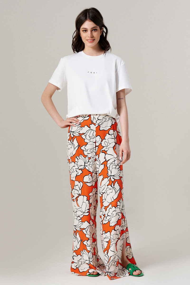 Брюки женские расширенные к низу из вискозной ткани для повседневной носки. Верхний срез брюк обработан притачным поясом на резинке. В брюках расположены в боковом шве небольшие разрезы. Отличный вариант брюк, которые будут гармонично смотреться под любые изделия.