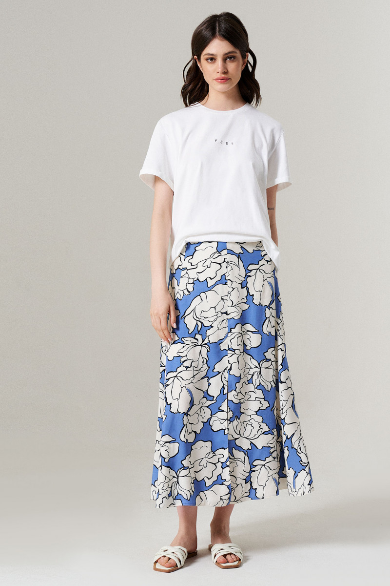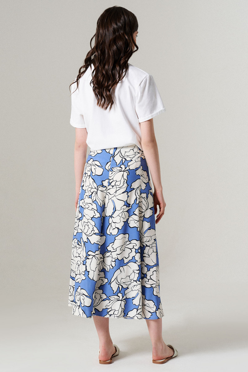 Юбка женская из вискозной ткани прямого силуэта на подкладке для повседневной носки. Подкладка из вискозной ткани. Верхний срез юбки обработан обтачкой. Переднее полотнище юбки со средним швом и разрезом в шве. Юбка имеет боковую часть. Заднее полотнище со средним швом и с застежкой молнией в шве. Длина изделия миди. Очень легкая и воздушная юбка в которой вы всегда будете в центре внимания.