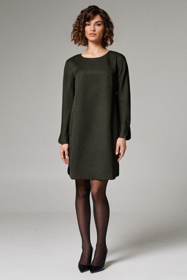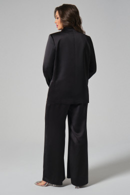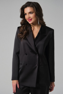 Жакет двубортный с декоративными обтяжными пуговицами. Жакет прямого силуэта, с отрезными бочками. По переду имеются прорезные карманы в рамку. Жакет с V-образным вырезом, с воротником пиджачного типа и отложными лацканами фигурной формы. Рукава длинные.