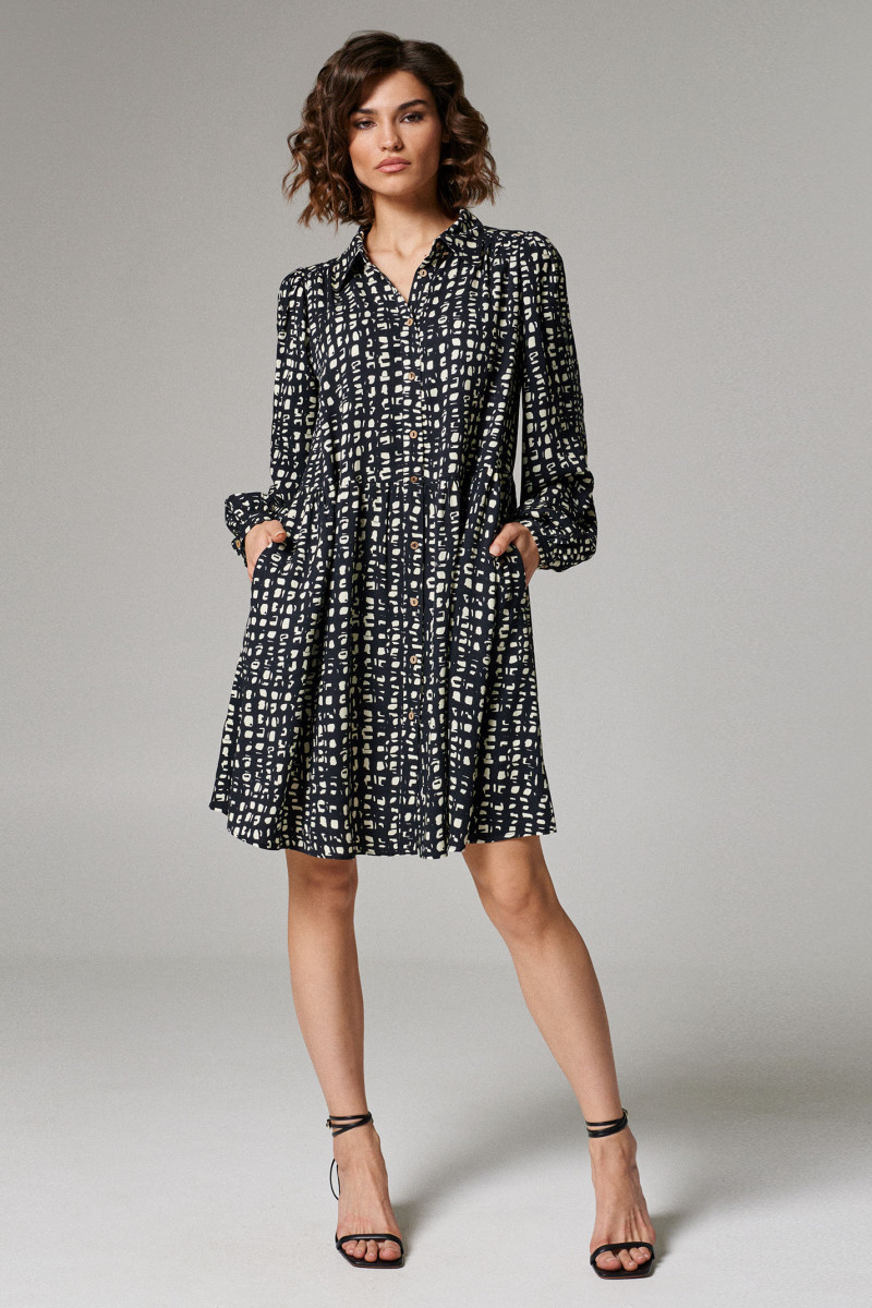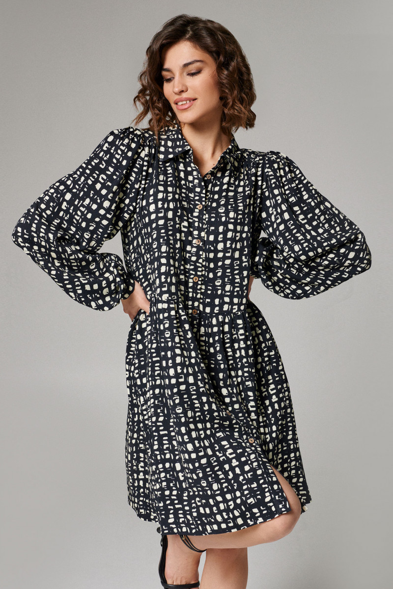 Платье женское из вискозной ткани для повседневной носки. Без подкладки. Платье прямого силуэта с прорезными карманами в боковых швах, Платье отрезное по талии. Воротник-стойка. Застежка фронтальная на пуговицы. Рукава длинные оформлены манжетой.