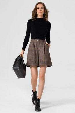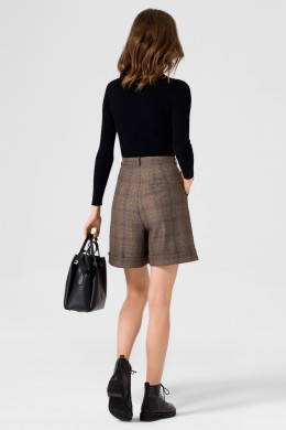 Стильные шорты из мягкой костюмной ткани с целнокроеным манжетом по низу. Шорты на отрезном поясе.Застёжка спереди на гульфик с молнией и петлю-пуговицу на поясе. Шорты прилегают сверху и расширены книзу. От верхнего среза по переду выполнены складки. От бокового среза выполнены косые входы во внутренние карманы. Шорты являются стильным предметом базового гардероба и эффектно подчеркнут образ современной деловой леди.