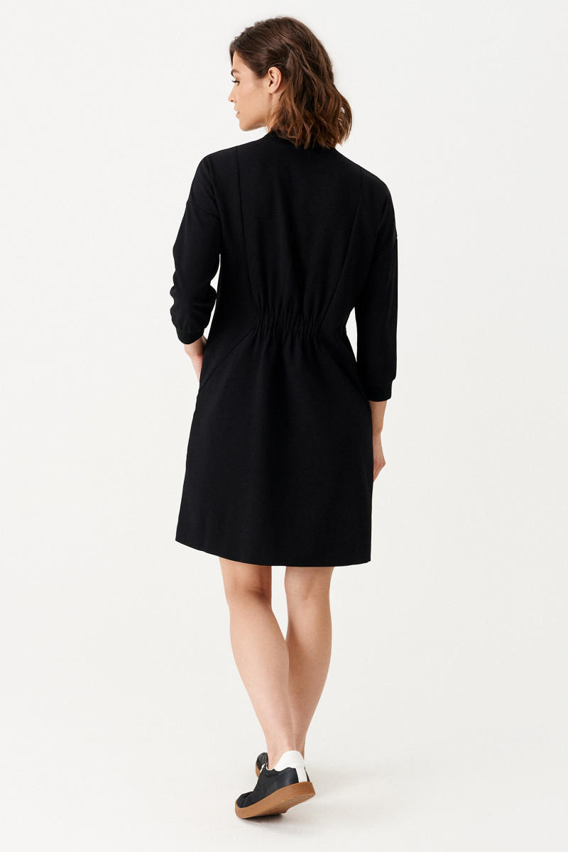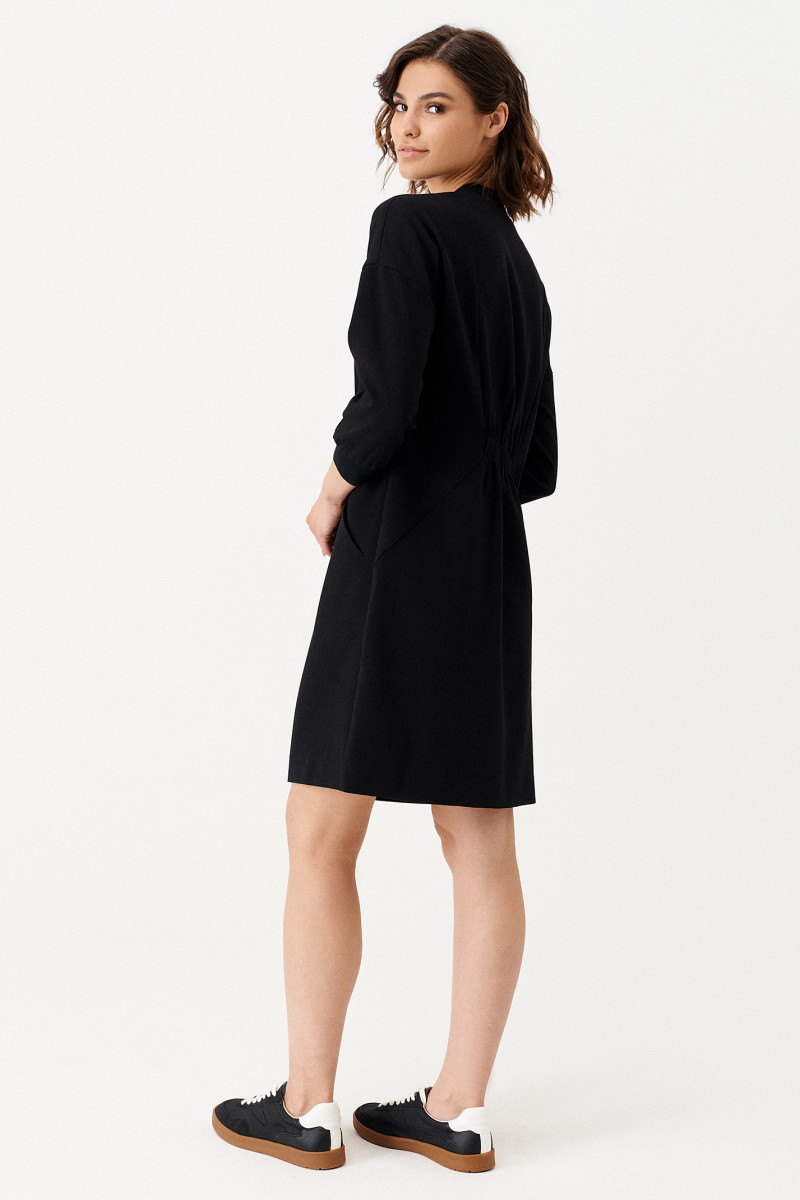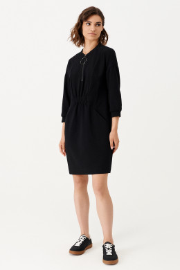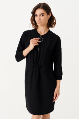 Платье женское из поливискозной ткани для повседневной носки. На передней части платья от горловины вставлена молния, есть рельефы и прорезные карманы. Так же на передней части в области талии вставлена резинка. На задней части платья так же есть рельефы и вставлена резинка в области талии. Рукава втачные укороченные. По низу рукава манжеты. Ткань однотонная