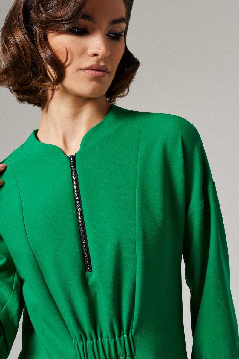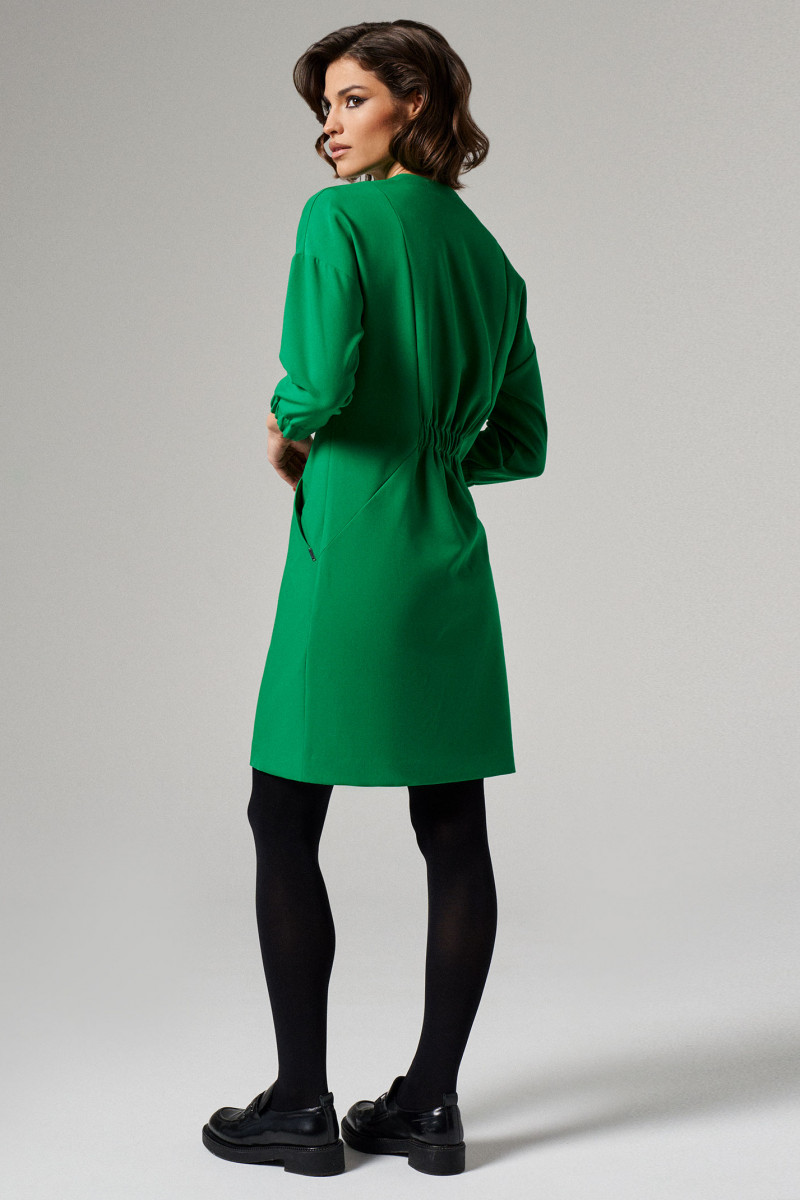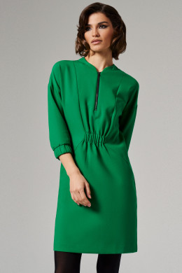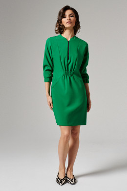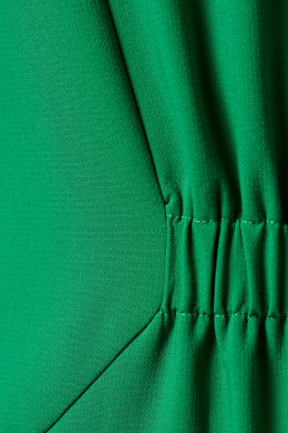 Платье женское из поливискозной ткани для повседневной носки. На передней части платья от горловины вставлена молния, есть рельефы и прорезные карманы. Так же на передней части в области талии вставлена резинка. На задней части платья так же есть рельефы и вставлена резинка в области талии. Рукава втачные укороченные. Ткань однотонная