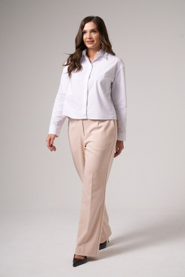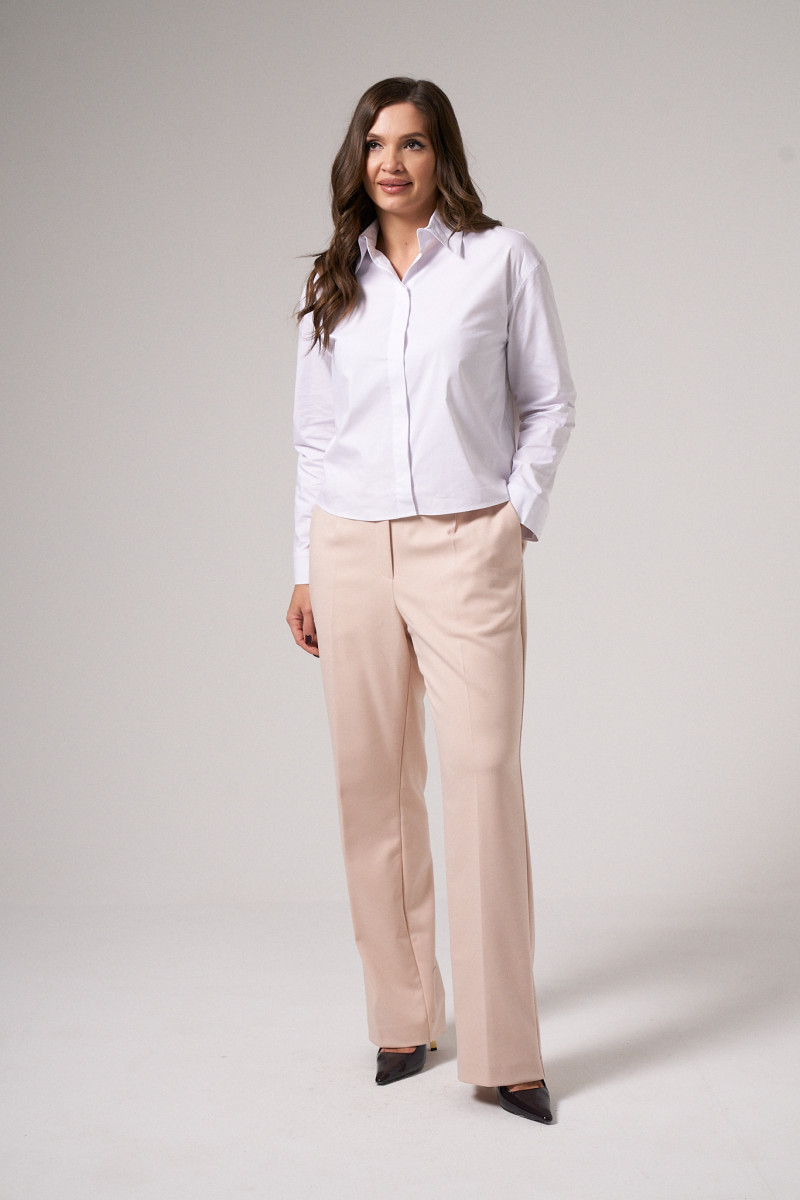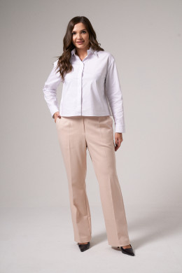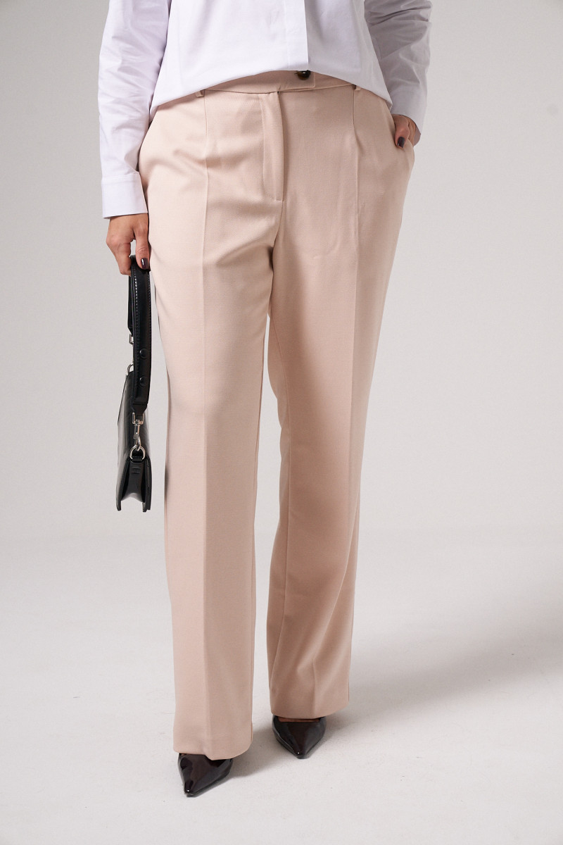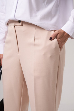 Брюки женские из поливискозной ткани для повседневной носки. Брюки прямые, слегка зауженные. На передней части брюк есть боковые карманы.Верх брюк обработан отрезным поясом, застёгивающийся на тесьму-молнию и потайной крючок. На задней части брюк есть талиевые вытаки и прорезные карманы. Ткань однотонная.